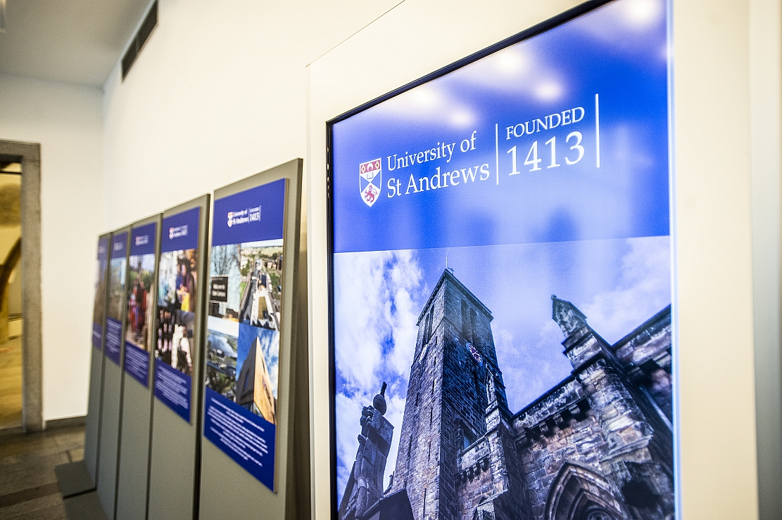 Charles University and delegates from the University of St Andrews had a chance to catch up this week in Prague, to reflect on past successes within their partnership agreement and build on further cooperation in the future. Representatives from both schools met at the foyer of the rectorate and historic Carolinum to open an exhibition about St Andrews before sitting down to a day of presentations and looking ahead.