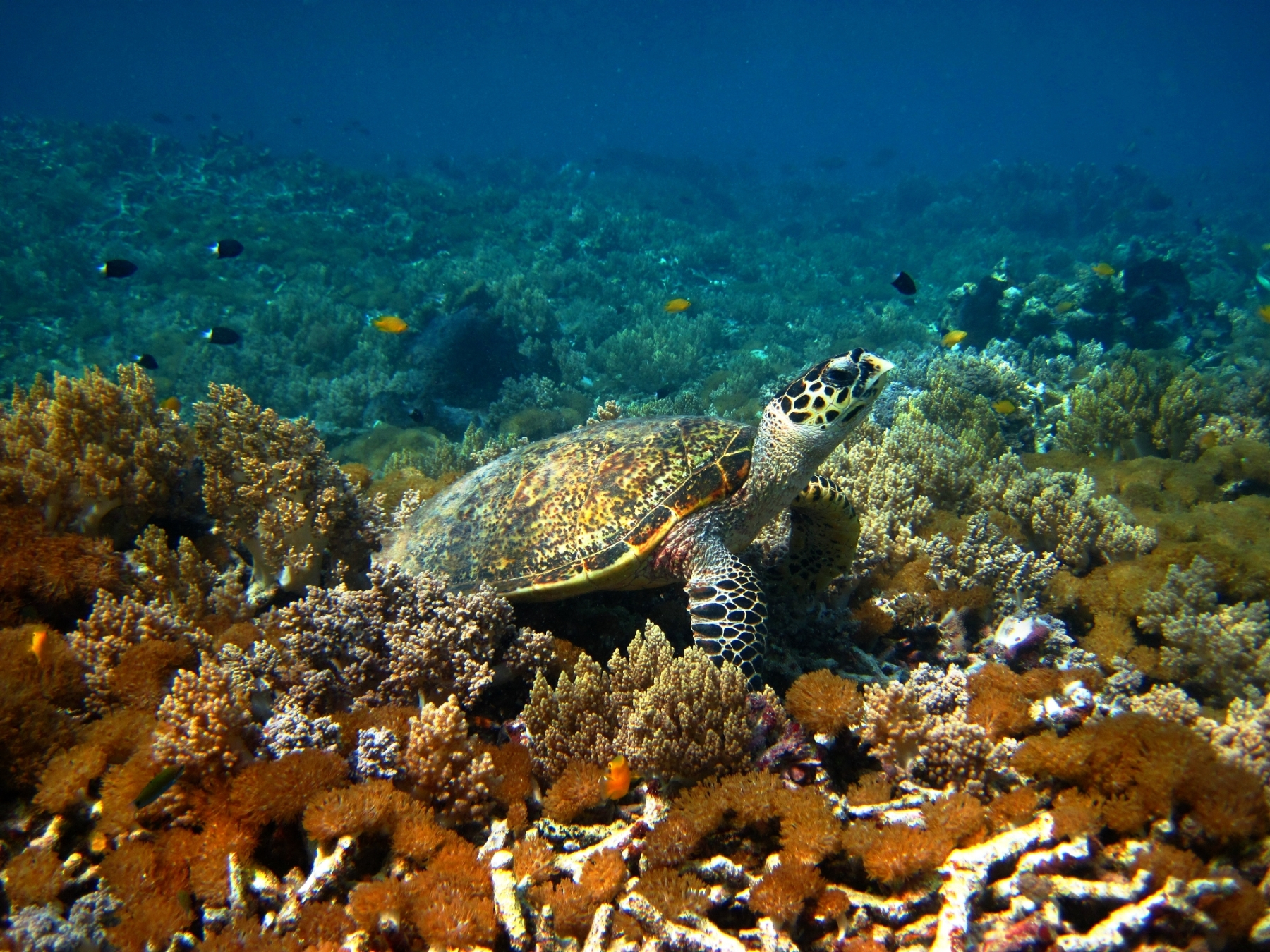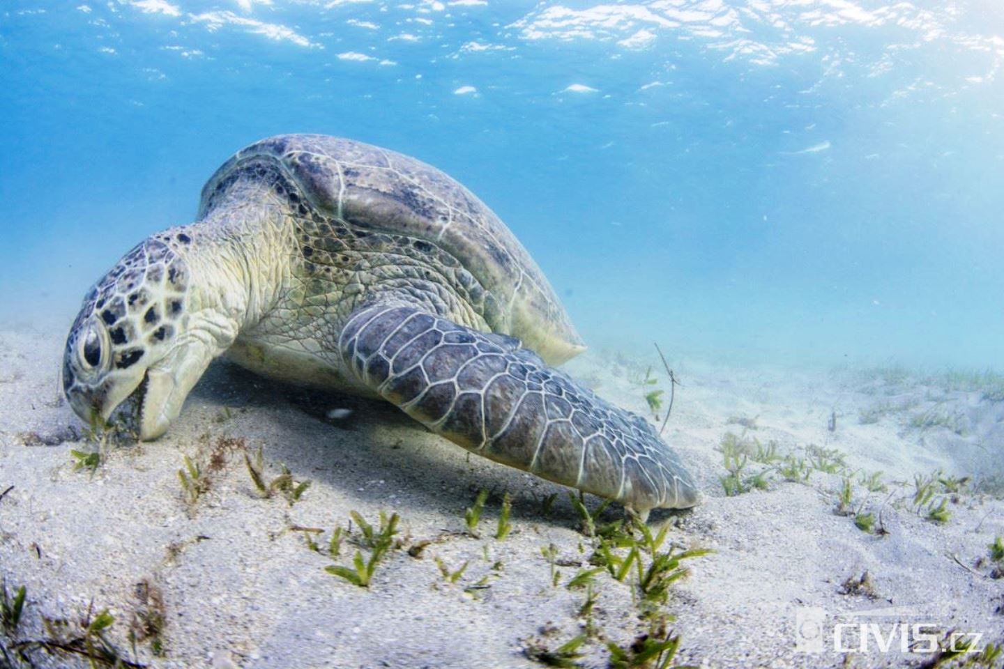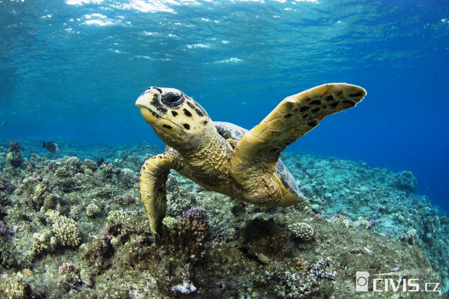 Hawksbill sea turtle (Eretmochelys imbricata) are large turtles that are critically endangered (Photo: Marcela Justiánová, www.morskezelvy.cz).