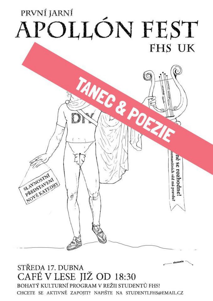 Přijďte se pobavit na festival tvořivosti studentů Fakulty humanitních studií UK Apollón fest. Součástí festivalu bude výstava studentských děl, promítání krátkých filmů, předčítání studentské literární tvorby. Ve studentském stánku si budou moci návštěvníci sami také něco vyrobit. Apollón fest se koná ve středu 17. dubna 2013 v café V lese od 18.30.