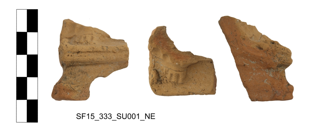 A fragment of terracotta statue depicting figure seated on a throne is an accidental find detected in the field, lying on the surface (Fig. 13, bellow).