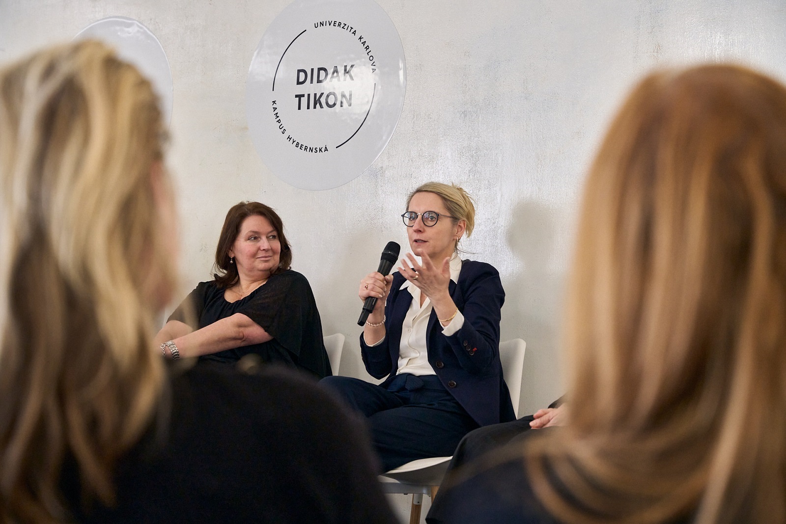 The first debate brought together women working in top management positions (Left side Photo 1, from left): two-time former Minister of Education Miroslava Kopicová, the rector of Charles University, Milena Králíčková, the representative of the European Commission in the Czech Republic Monika Ladmanová and the rector of the Academy of Performing Arts in Prague, Ingeborg Radok Žádná.