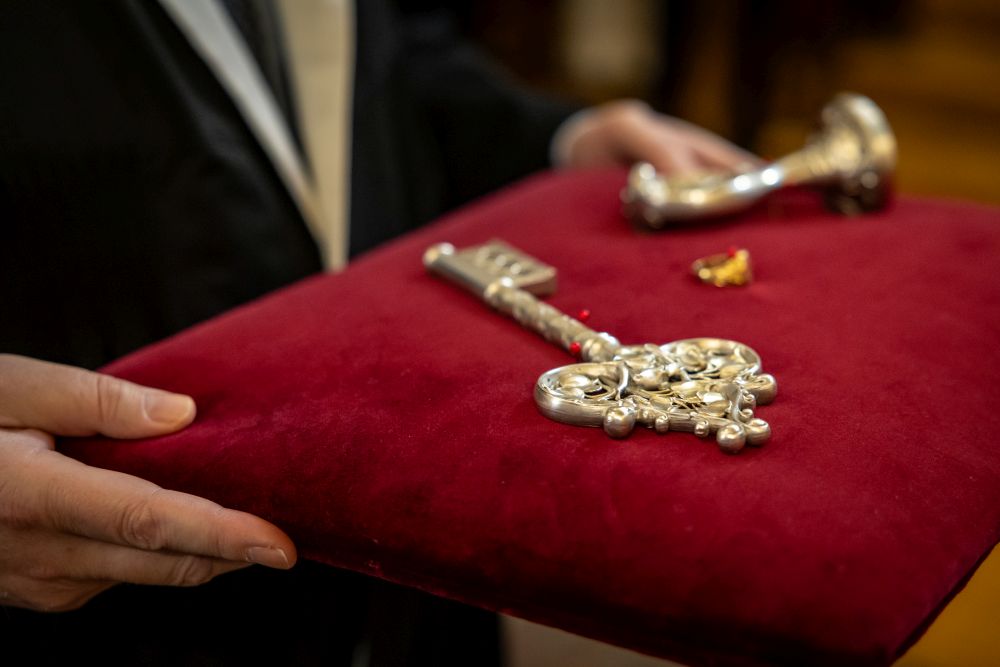 Jiří Zima also took over the Rector’s sceptre topped with the cross as a symbol of his authority over the entire Charles University academic community. The key then refers to the university’s property and assets, which the Rector must manage responsibly. The ring symbolizes an indivisible bond with the entire university community. The chain with a medal, which the Rector wears at various ceremonies and official meetings, is a sign of the dignity of the highest academic office and a symbol of all the rights conferred on the Rector.