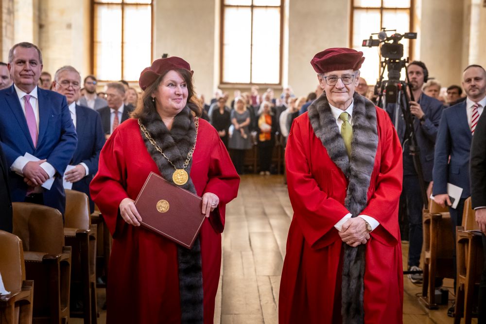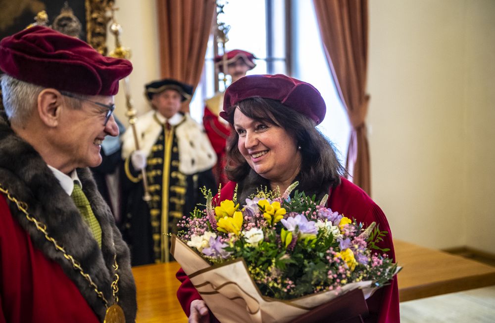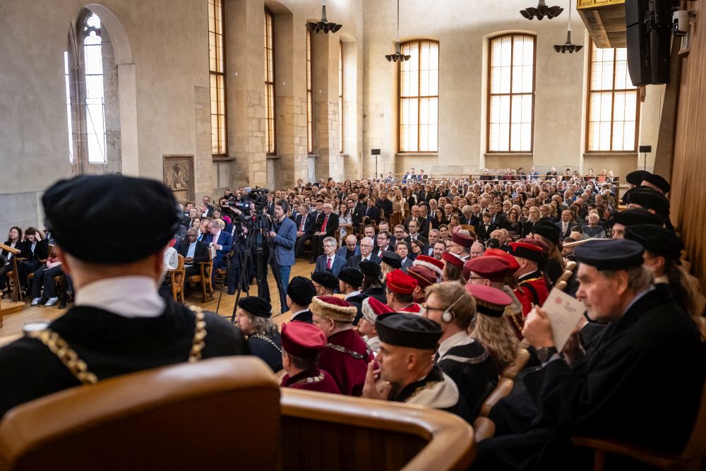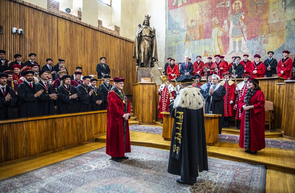 The new rector and the election process were presented to the audience by Josef Staša, chair of the Charles University Academic Senate. Then, as is tradition, outgoing Rector Milena Králíčková gave a summary report on the university’s status, life, and activities from 2022 to 2026, when she headed it. “I am proud that we have managed to strengthen the university’s economic stability, and during my term of office, average salaries at the university have increased by 34 percent. The university’s annual budget increased by CZK 2.9 billion, and I also consider it a success that we have been able to start receiving donations from donors –most recently, for example, a donation of CZK 48 million from The Kellner Family Foundation to support the return of excellent scientists,” said the Rector. “We have paid close attention to our students. We have increased the capacity of our psychological counseling services by more than 200%, established a Resilience Centre, and strengthened our system of support for the well-being of students and employees with a range of preventive activities, such as the Centre for Mental Health,” she added.