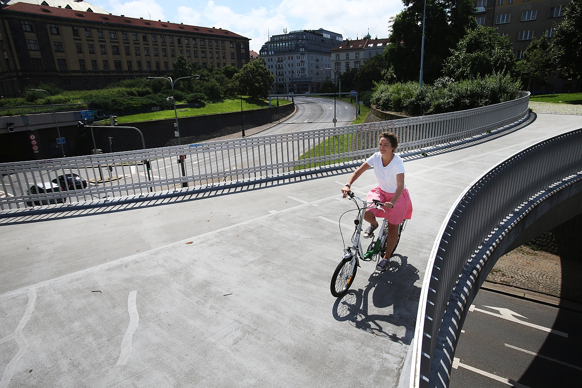 As an experienced cyclist – used to biking daily from the village of Černý vůl near Horoměřice just outside of Prague – Jakub is not put off by signals or signs on paths that end abruptly or don’t yet exist. We continue. He bikes ahead, calmly turning at the intersection that leads us parallel to the Vltava River. Here, cyclists finally feel the city is theirs. There is more room to breathe, even if, at peak times, traffic can be dense here as well.