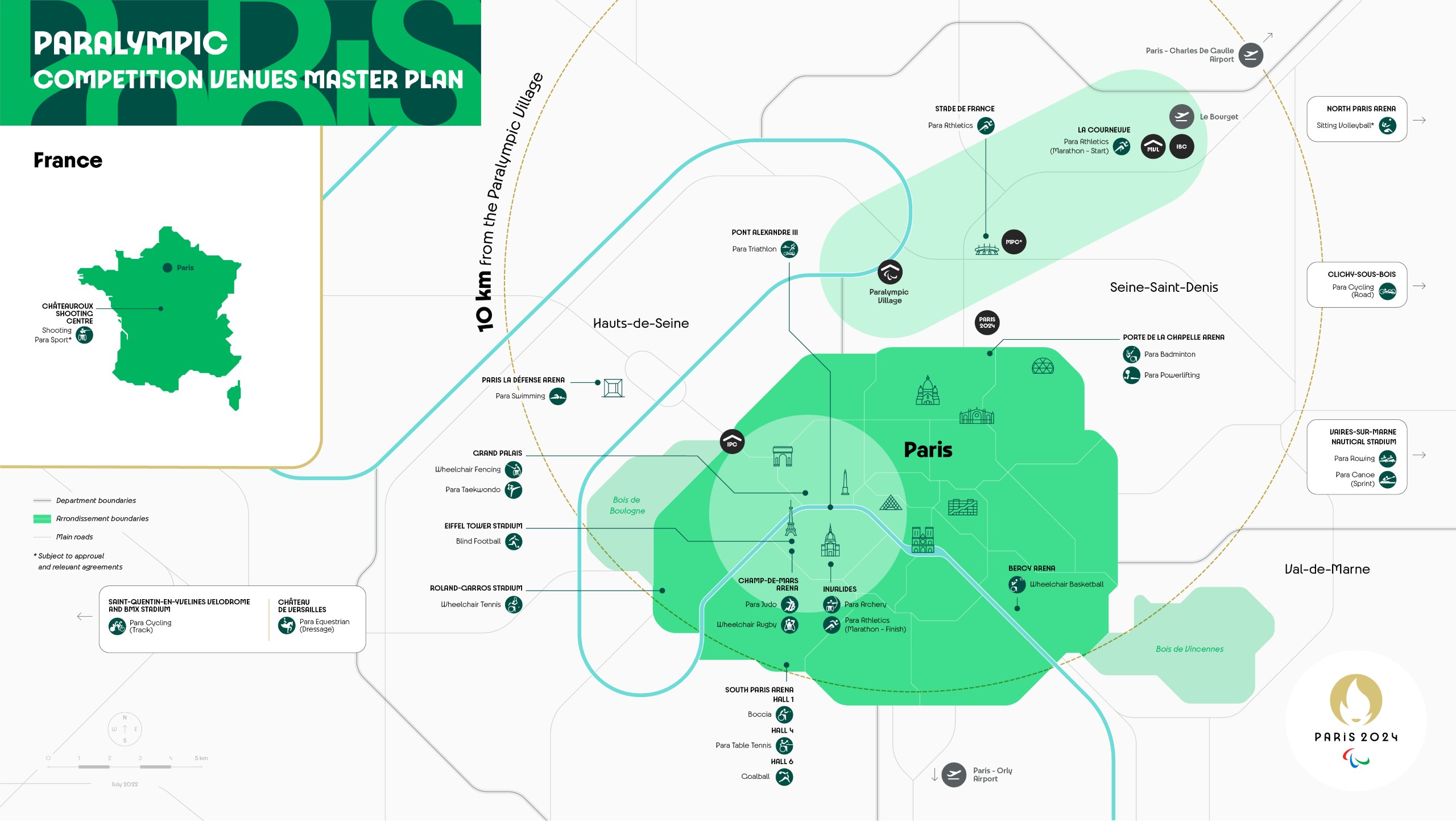Přehled paralympijských sportovišť na nadcházejících hrách v Paříži 2024. Řada z nich je situována přímo v centru francouzské metropole.