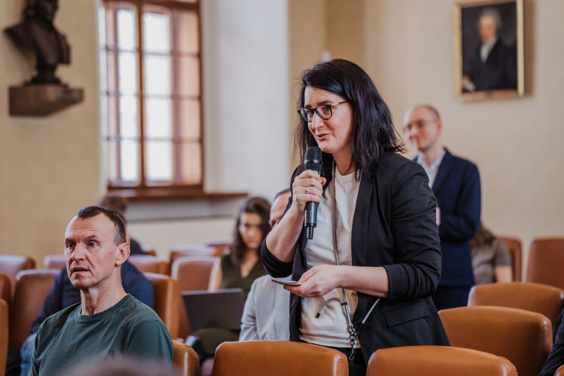 Kristin A. Glad discusses the findings of a crucial impact study she and colleagues worked on closely. To her left, CU Vice-Rector L. Henebergová.