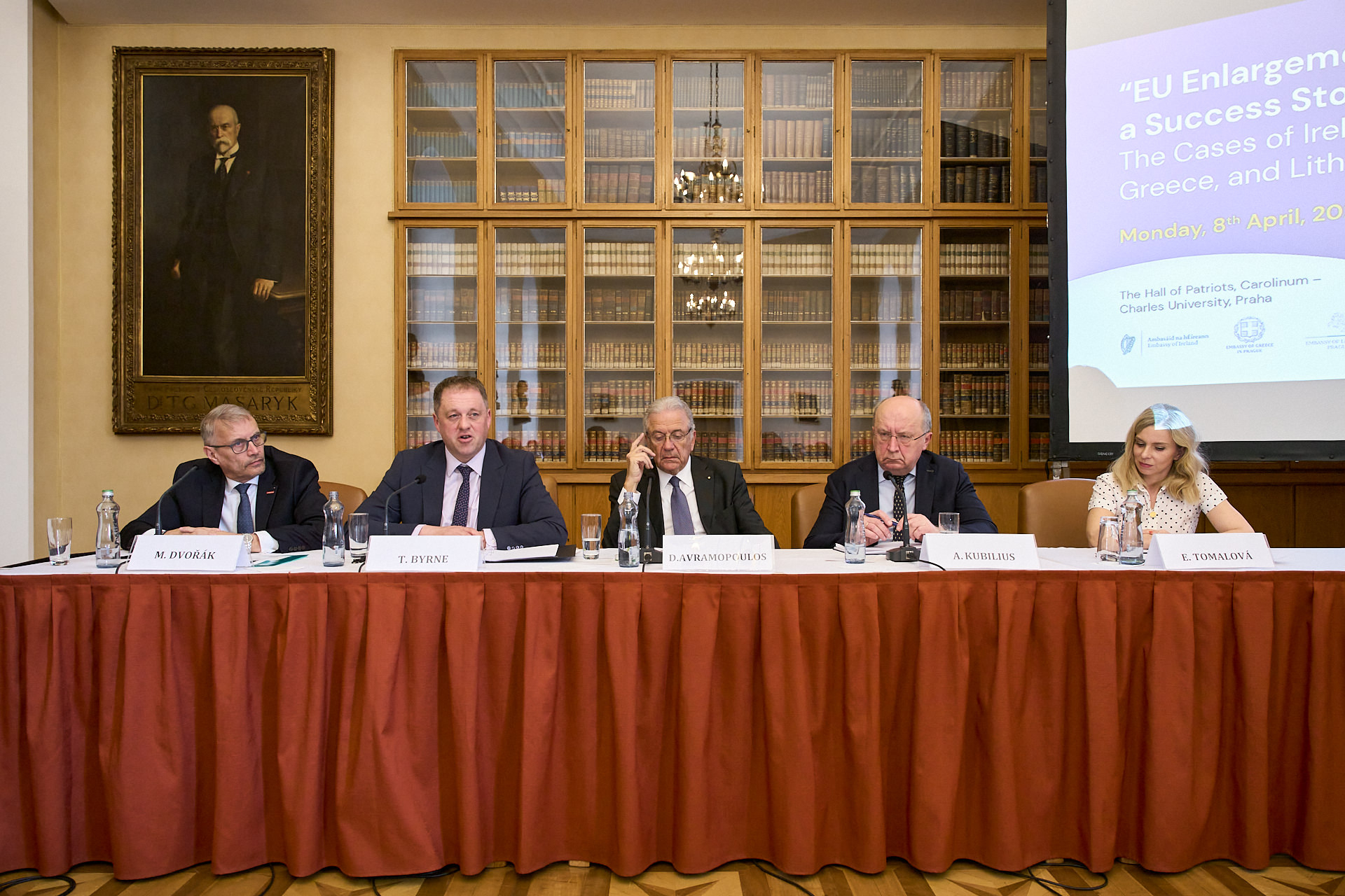 Organised by the Embassies of Ireland, Greece, and Lithuania in Prague, in conjunction with the Office of the Minister for European Affairs, the event looked at the past, present and future, with each period offering specific challenges, successes as well as difficulties and missteps. Presented by speakers were effectively individual case studies of countries transformed by membership at different inflection points: Ireland in 1973, Greece in 1981, and Lithuania in 2004 (the last representing the largest single wave of accession which also included the Czech Republic and other former members of the Warsaw Pact).