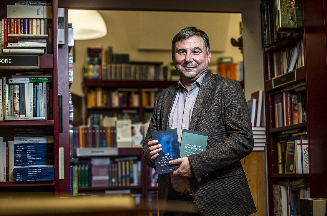 Ivan Krastev at CU's Karolinum Bookshop with Czech editions of his work including The Light that Failed co-written with Stephen Holmes.