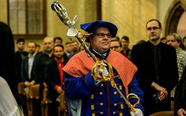 The New Mace and Ceremonial Gown exhibit held from the 19th January until 20th February 2018 in the Cloister of the Karolinum, the central point of Charles University nestled in the centre of Prague, showcased the Faculty of Social Sciences new ceremonial mace and gown. The ceremonial mace plays an important role in the graduation and matriculation of Charles University students; students lay their fingers on the mace to honour their commitment and loyalty to the University.