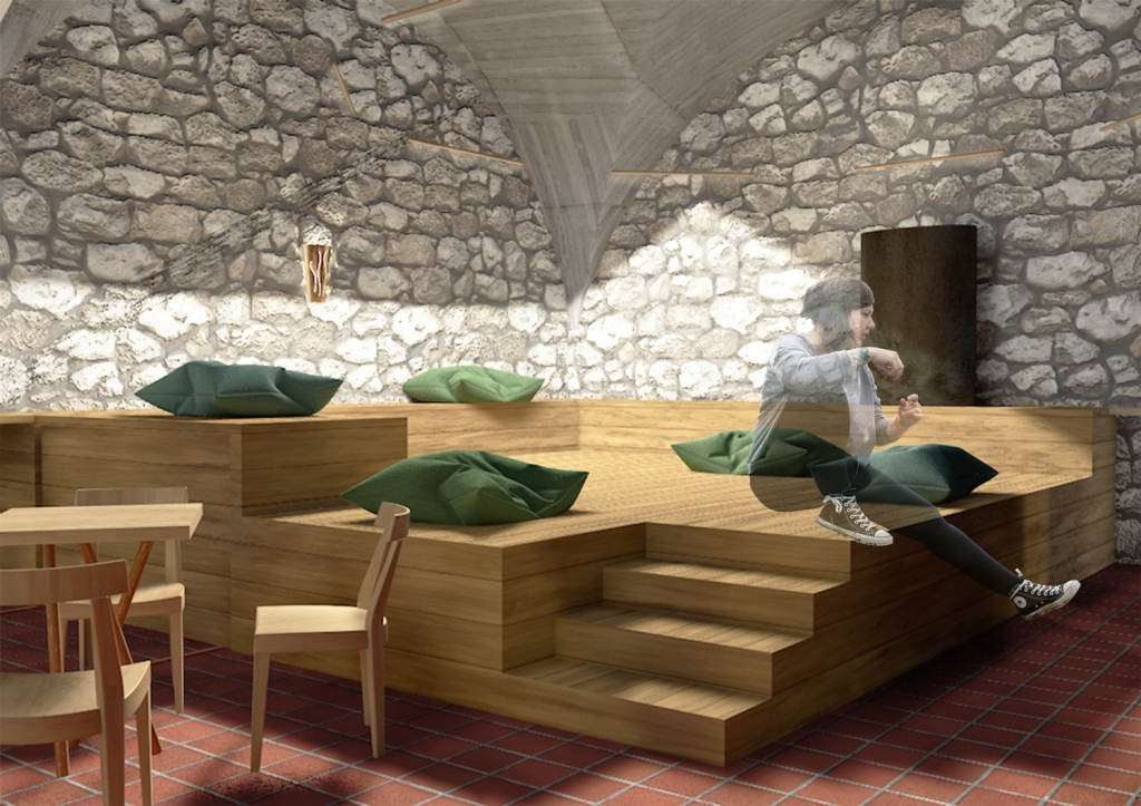 Druhou největší změnou vítězného návrhu je zvýšené dřevěné pódium, jakási tribuna v zadní části hlavního sálu. Tento prostor je od zbytku oddělen klenebním pásem a jiným typem klenby, je tedy vhodné, aby byl odlišně zařízen. Primárně je pódium určeno pro pohodlné usazení návštěvníků v sedacích vacích. Při koncertech na hlavním pódiu zde mohou návštěvníci navíc i sedět na vyvýšené hraně či zde mohou být rozestavěny židle. Samotné pódium bude v dutém jádru ukrývat velký skladovací prostor, kde budou uloženy skládací stoly, židle nebo i zmiňované sedací vaky, a hlavně celý zvukařský pult. Na rozvodném racku, který bude přístupný i v případě uschování zvukařského pultu, bude možno ovládat podkresovou hudbu v sále. Návštěvníky zde čekají autorská čtení, koncerty, přednášky nebo promítání filmů.