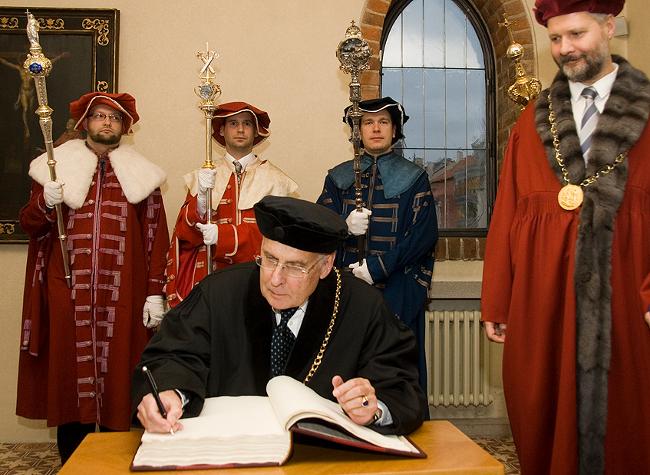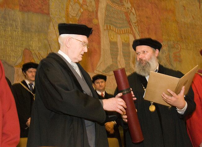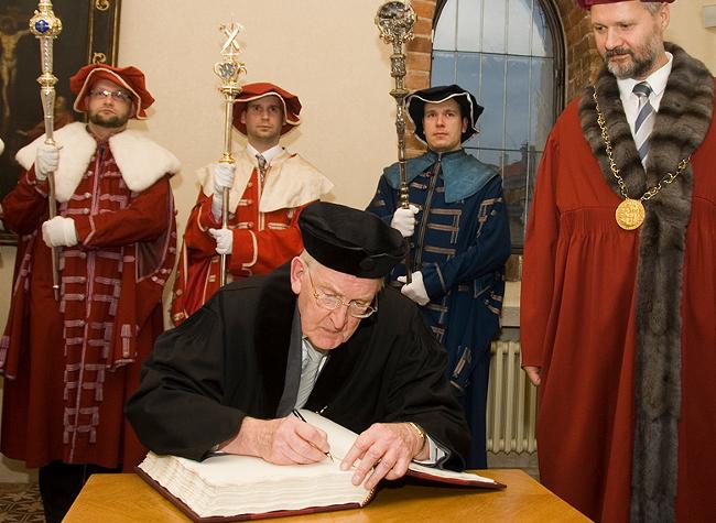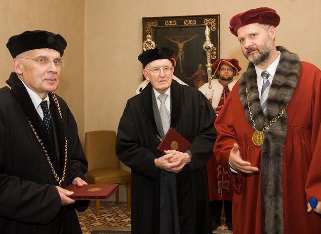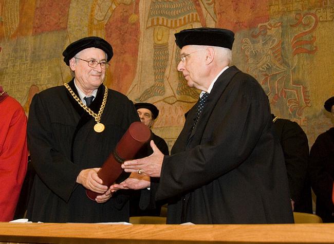 Rektor UK profesor Václav Hampl vyjádřil potěšení, že Univerzita Karlova vyznamenala čestnými tituly osobnosti v mezinárodních vědeckých kruzích tak uznávané.