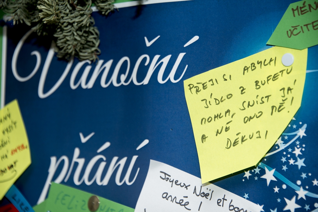 Zároveň si je možné na nástěnce vedle vrátnice přečíst vzkazy fakultě. Ty nejzajímavější by se měly objevit i na plazmové obrazovce ve vestibulu. „Moc děkuji za vzkazy. Myslela jsem si, že budou přáním fakultě, ale jsou to spíše přání pro fakultního Ježíška. Je tady celá řada věcí, které nás jako pedagogy musí zajímat, a je jasné, že potřebujeme neformální platformu, kde studenti mohou sdělit svá přání,“ prohlásila děkanka Wildová.