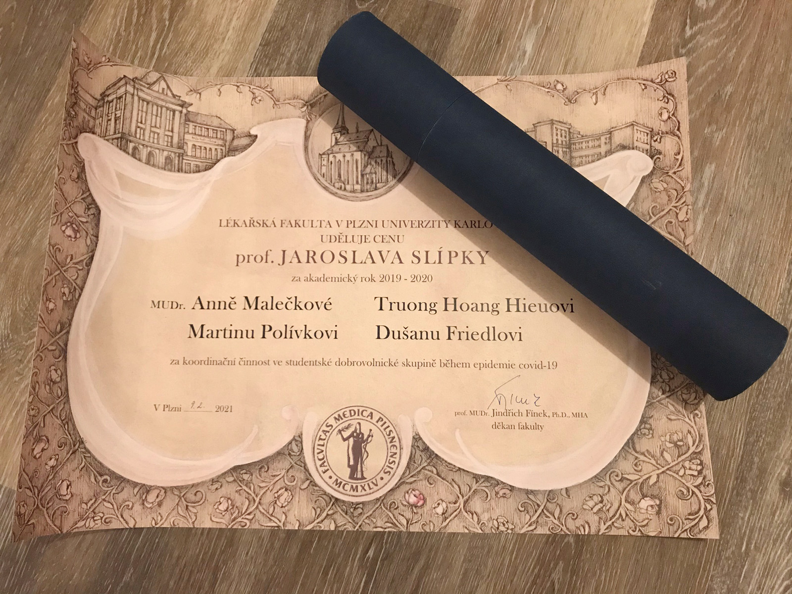 Cenu Jaroslava Slípky uděluje Lékařská fakulta v Plzni UK za přínos studentů k rozvoji fakulty v oblasti vzdělávací, kulturní a společenské. Za akademický rok 2019/20 ji obdrželi koordinátoři dobrovolnické pomoci studentů při zvládání epidemie covid-19. Doktorandka Anna Malečková byla jedním z nich.