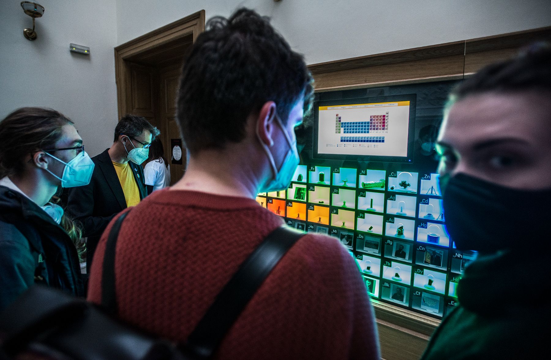 Na chodbě chemického ústavu zase návštěvníci měli možnost vidět celou řadu chemických prvků, a to ve stavu, ve kterém se s nimi nikdy dříve nesetkali. „Třeba vápník je zde – překvapivě – prezentován jako kov. Jde o krásný zlatolesklý prvek, což zřejmě málokdo ví,“ vybíral jeden z trumfů chemik Pavel Teplý z katedry učitelství a didaktiky chemie. O interaktivní periodickou tabulkou prvků je od jejího vzniku v roce 2019 (slavnostní odhalení proběhlo dne 15. března 2019, tedy na den přesně po 150 letech, kdy profesor Mendělejev s tabulkou poprvé seznámil mezinárodní vědeckou komunitu – pozn. red.) velký zájem, zejména ze strany žáků středních a základních škol z celé republiky.