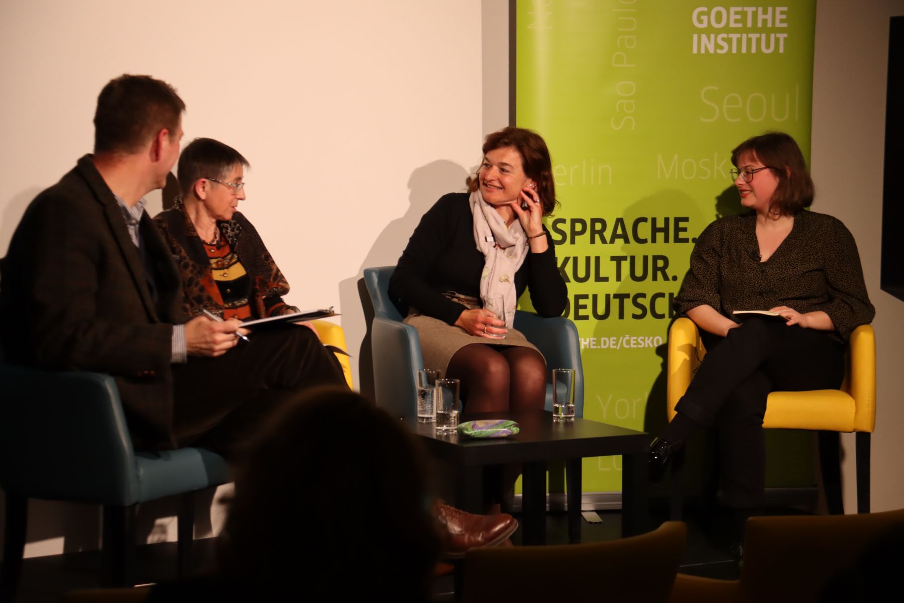 Momentka z panelové diskuze, zleva moderátor Aleš Vlk z portálu Vědavýzkum.cz, Colette Guillopé, Tereza Petrusková a Viktoria Niebel.