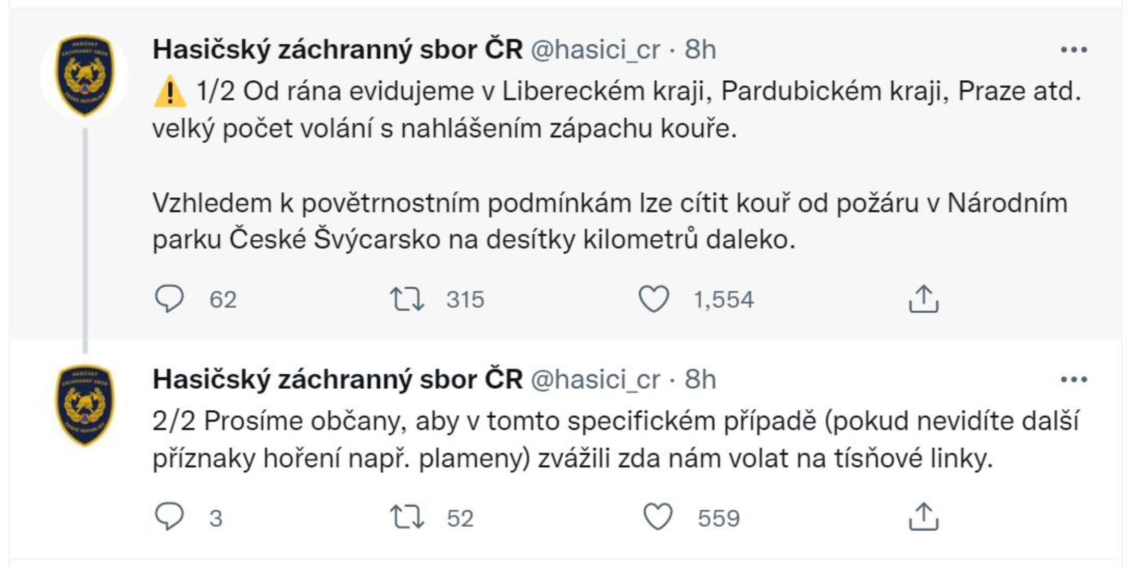 A jak ve twitterovém vlákně rozebírá Jáchym Brzezina, vedoucí oddělení kvality ovzduší Českého hydrometeorologického ústavu Brno, aktuální požáry v Českém Švýcarsku jsou ukázkovým příkladem přírodního zdroje v znečišťování ovzduší.