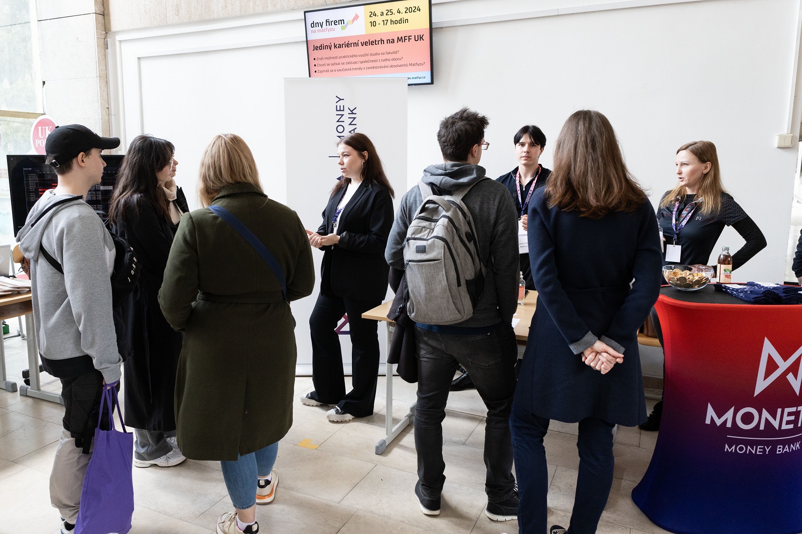 „Už včera bylo u stánků neustále živo, zástupci firem si stěžovali, že jsou úplně vymluvení a nestíhali si ani odskočit. Takže účel veletrhu evidentně splněn,“ směje se Lenka Zubáková z organizačního týmu MFF UK, který Dny firem na Matfyzu připravuje. „V předchozích ročnících to bývalo tak, že největší nápor studujících jsme evidovali během pauz mezi přednáškami. Letos byl zájem o firmy permanentní. Nepoznala byste, že v okolních prostorách probíhá klasická výuka,“ říká Barbora Joudalová, jež řídí vše okolo Dnů firem na Matfyzu již třetím rokem. Do té doby připravovala veletrh pro fakultu externí firma na klíč.