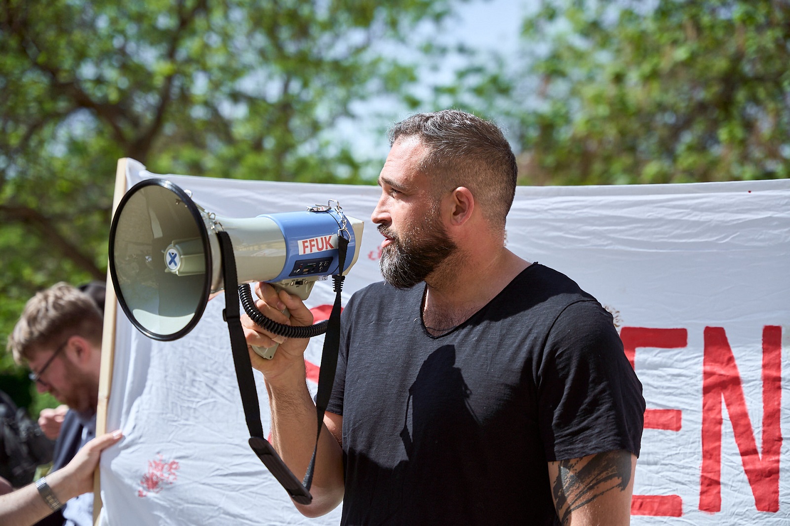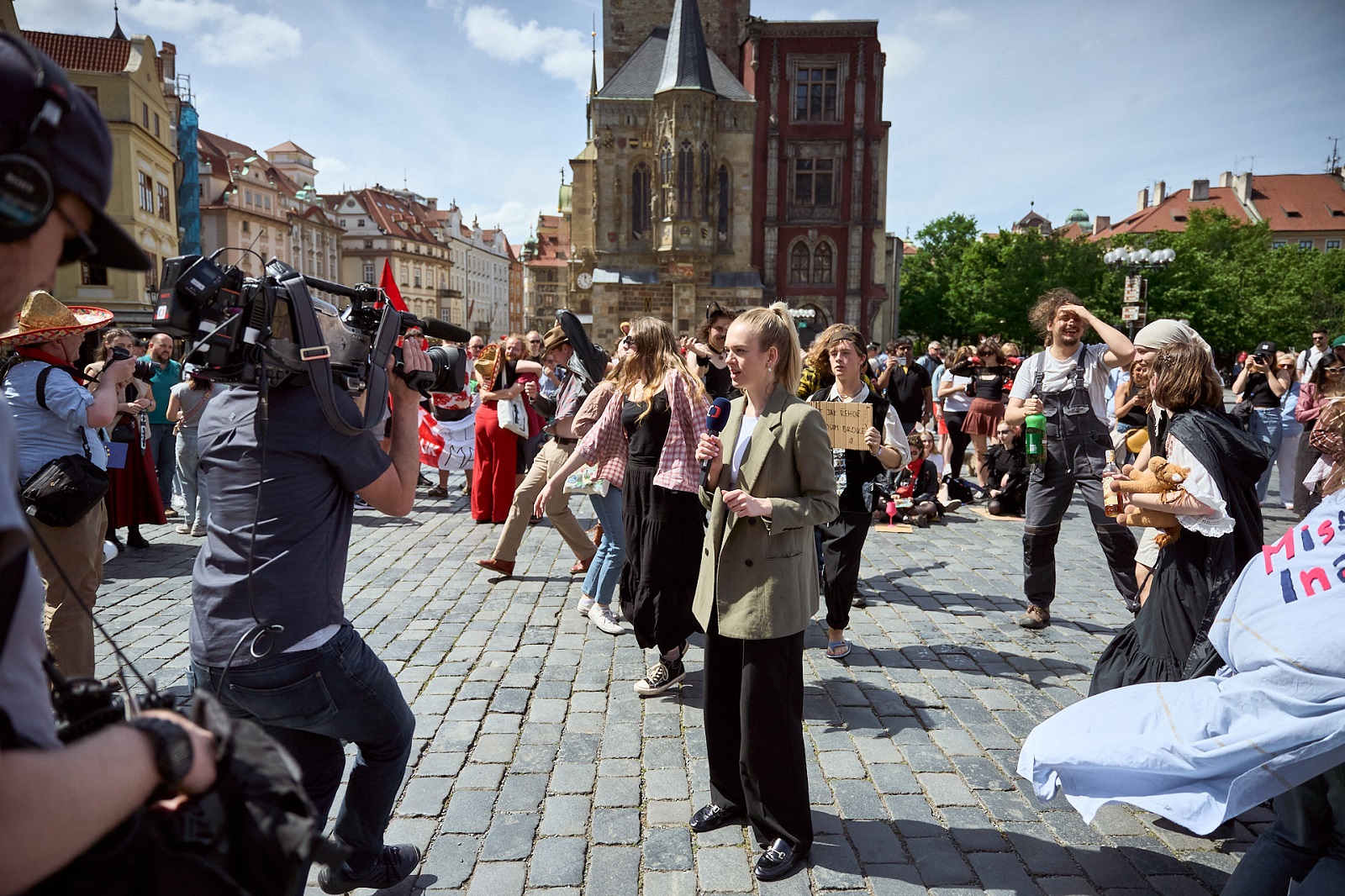 „Prosím o klid,“ řve už poněkud zoufale Honza Géryk, aby mohl předat slovo prvnímu z řečníků, kteří vždy promlouvají k účastníkům průvodu na Karlově náměstí. „Sami teď můžete vidět, že pokud se shromáždí větší množství lidí, řekněme okolo sta až dvou set, svědčí to o přítomnosti určité myšlenky. Systém, který se tak efektivně vpil do urbanistických návrhů staveb okolo nás, do toho, jak prožíváme veřejný prostor, se pak může trochu otřást,“ říká kolemstojícím posluchačům právní teoretik a spoluautor projektu Křik ve stroji. Svoboda jednotlivce a právní moc Petr Agha.