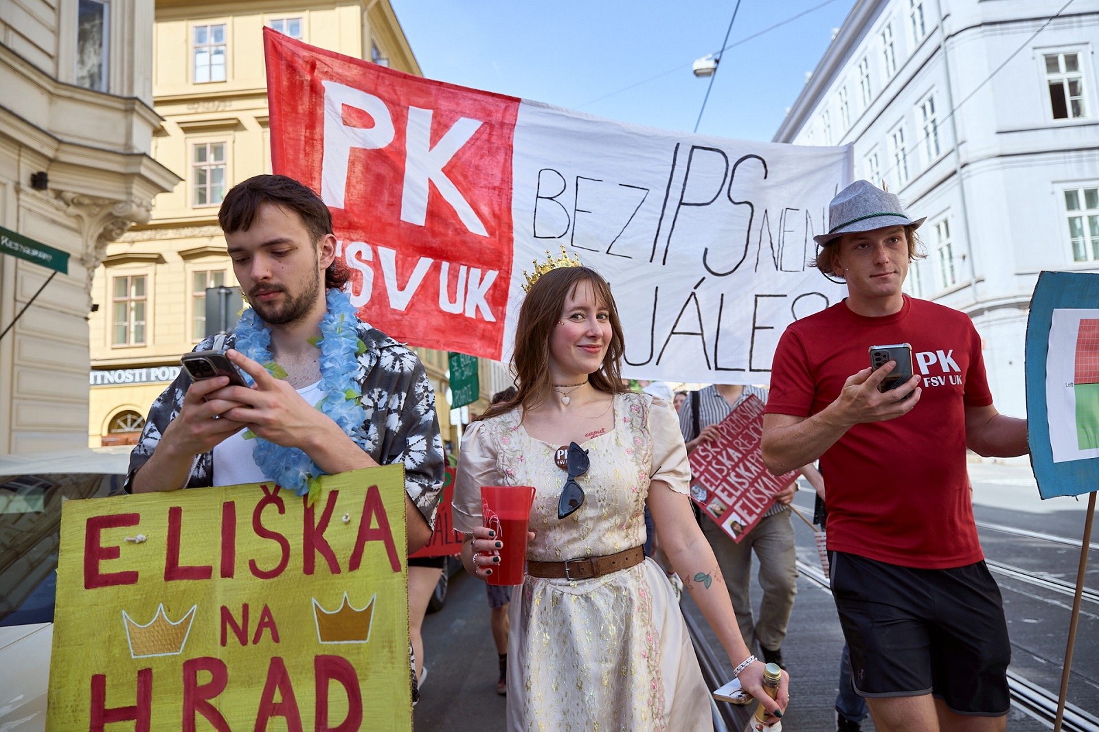 „Jsem tady už poněkolikáté. Podle mě nejlepší na tom všem je, že celá akce vychází autenticky od studentů ke studentům. Podporuje jejich kreativitu a je to vlastně jediný den, kdy si můžeme ve srandě říct, co bychom chtěli změnit,“ popisuje kandidátka na královnu, která si říká Miss Ina (čti Mizina) z družiny Missionáři z Právnické fakulty UK. „Studenti volí Mizinu, ať chtějí nebo ne!“ provolává cestou do Kampusu Hybernská a mává cedulí s nápisem Našla jsem si kluka, abych platila menší nájem. Družina Studentské rady FF UK Furry Farma zvířat zase prosazuje stejná práva pro zvířata i lidi. „Pokud vyhraju, můžete začít říkat majálesu mňauáles. Každý bude mít právo vyjadřovat své názory slovem, kvokem, řehotem, mečením, mňoukáním, nebo jiným způsobem,“ slibuje její kandidát Kočkokrál. Letos bojuje o krále či královnu Studentského Majálesu šest družin, což je rekordní počet.