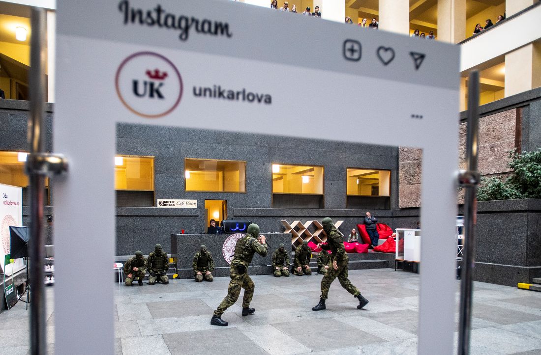 Na Karlovce je o zábavu opravdu postaráno. Taneční skupina Prdlý kosti, ve které tančí studující 2. lékařské fakulty UK, vystoupila hned dvakrát, stejně jako studující vojenského oboru na Fakultě tělesné výchovy a sportu UK, kteří ukázali akční souboje. Ze stejné fakulty je i olympionička Anna Šantrůčková, která návštěvníkům předvedla své veslovací schopnosti. Zájemci navíc mohli dopoledne v interaktivním kvízu změřit své síly s absolventem UK Václavem Slabyhoudkem alias Panem Lišákem z televizní soutěže Na lovu.