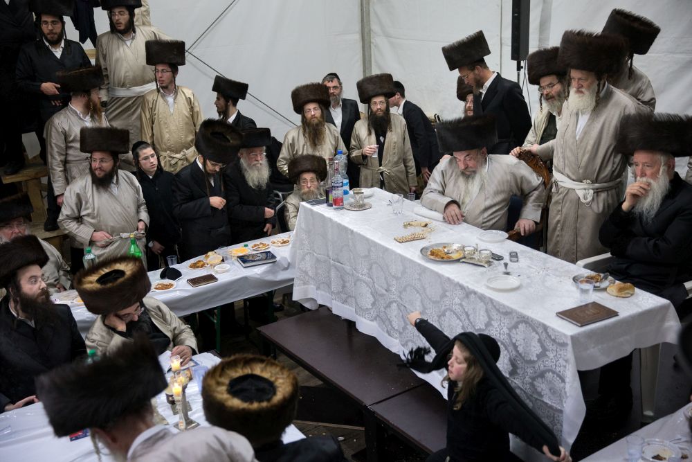 Lelowští chasidé slaví járcajt několik dní a oslavu si jak se patří užívají. Ve velkém vytápěném stanu naproti ohelu se dva dny zpívá, hoduje, pije a tančí. Večer se pořádá tisch – současný lelowský rabín Aron Biderman žijící po zbytek roku v Izraeli je usazen na židli podobné trůnu na podiu s několika vyvolenými stařešinami. U dlouhých stolů pod ním sedí vážení členové komunity a na lavicích kolem dokola postávají mladíci. Rabínovi přinášejí na velkých podnosech vybrané lahůdky jako třeba gefilte fiš – nadívanou rybu. Rabín si jen trochu zobne a zbytek ryb se bleskově rozdělí mezi ostatní chasidy. Talíře rychle putují po celém stanu. Hoduje se od rána. Jídla je nadbytek, plastové talíře se zbytky se vrší na stolech. Když chasidé dojedí, stáhnou je polští pomocníci i s dlouhatánskými plastovými ubrusy do odpadu. A brzy je prostřeno k další hostině. Vodka a víno teče proudem, ale vše musí být striktně košer, takže drtivá většina nápojů a potravin přiletí leteckými speciály z Izraele.