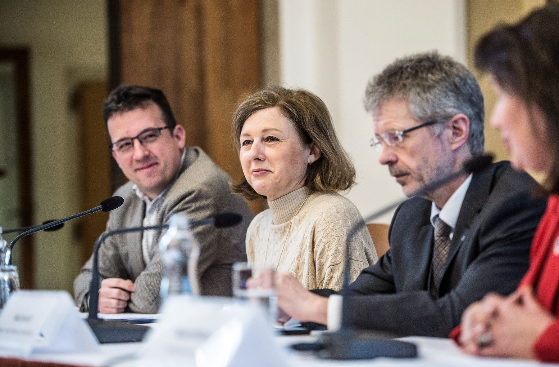 Na Univerzitě Karlově se setkali mimo jiné i eurokomisařka Věra Jourová (v béžovém) s rektorkou Milenou Králíčkovou (v červeném).