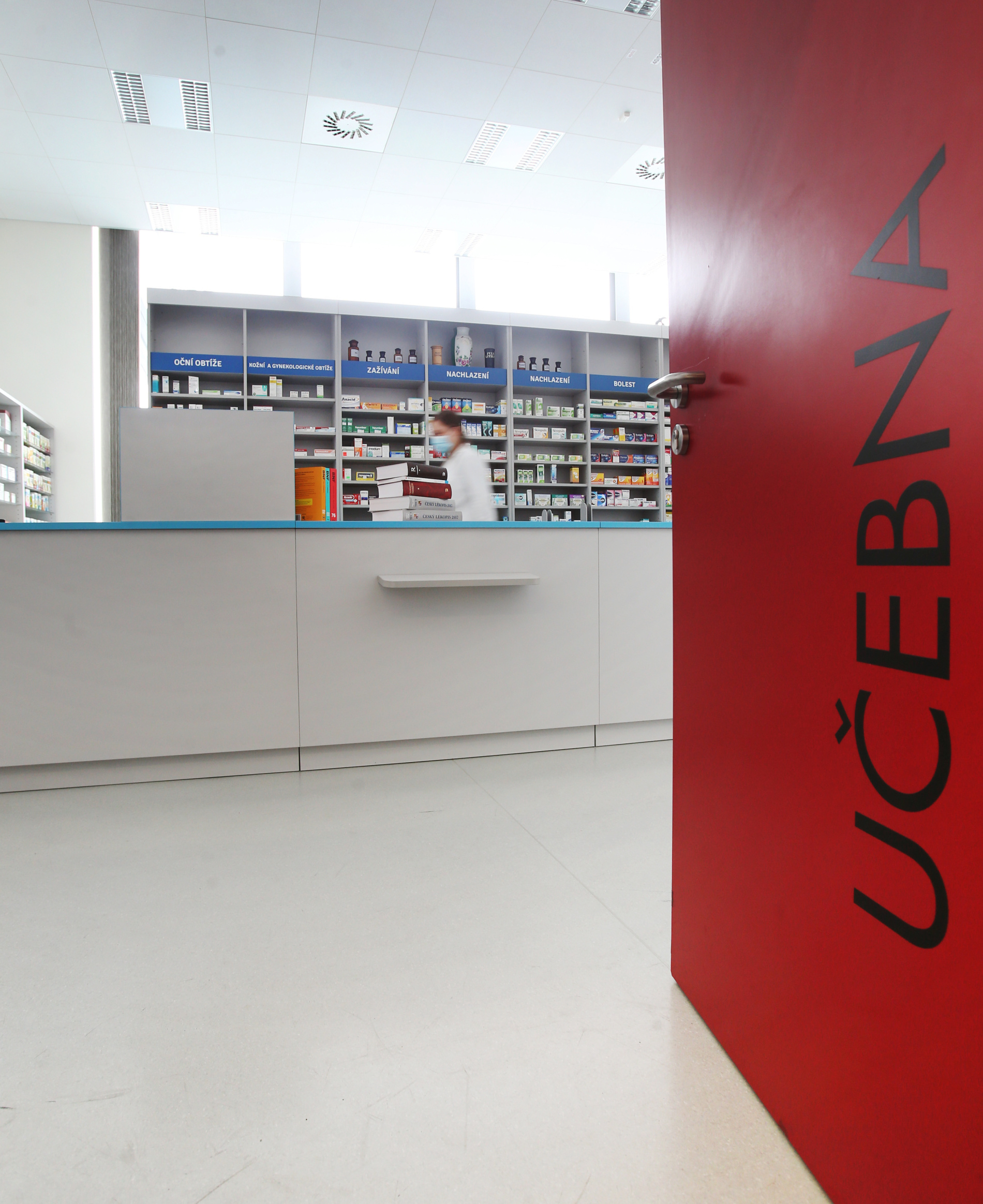 Studenti se na kontakt s pacientem speciálně připravují a pomáhá jim v tom i takzvaný „lékárenský trenažér“ – učebna simulující výdejní místnost běžné lékárny s tárou (výdejní místo) a úložným prostorem pro léčivé přípravky. „Nejprve se studenty trénujeme běžné situace při samoléčení nebo výdeji léčiv na recept v klasické učebně a potom si to zde v ,lékárně´ zkoušíme naostro,“ vysvětluje docent Malý u trenažéru.