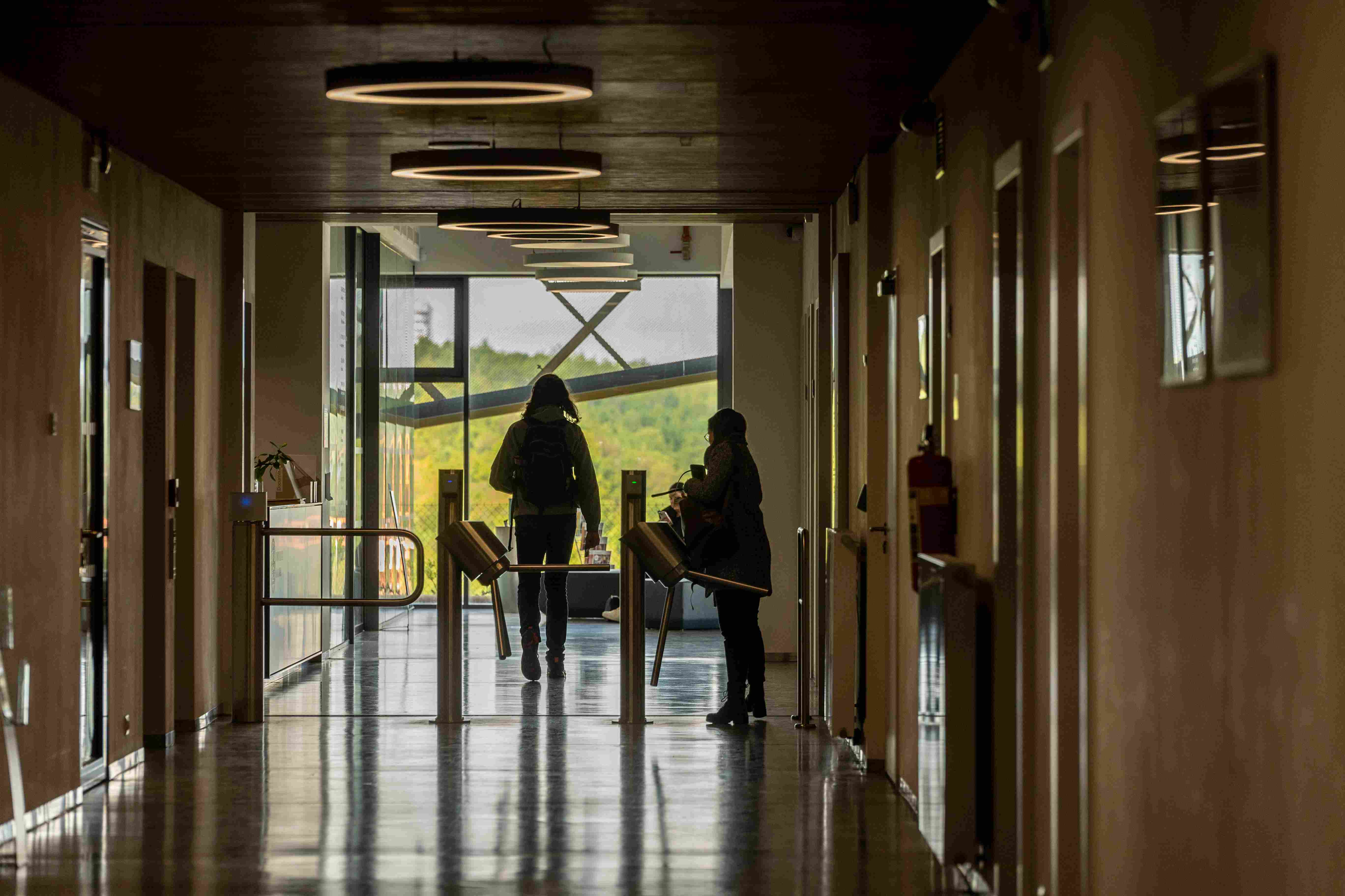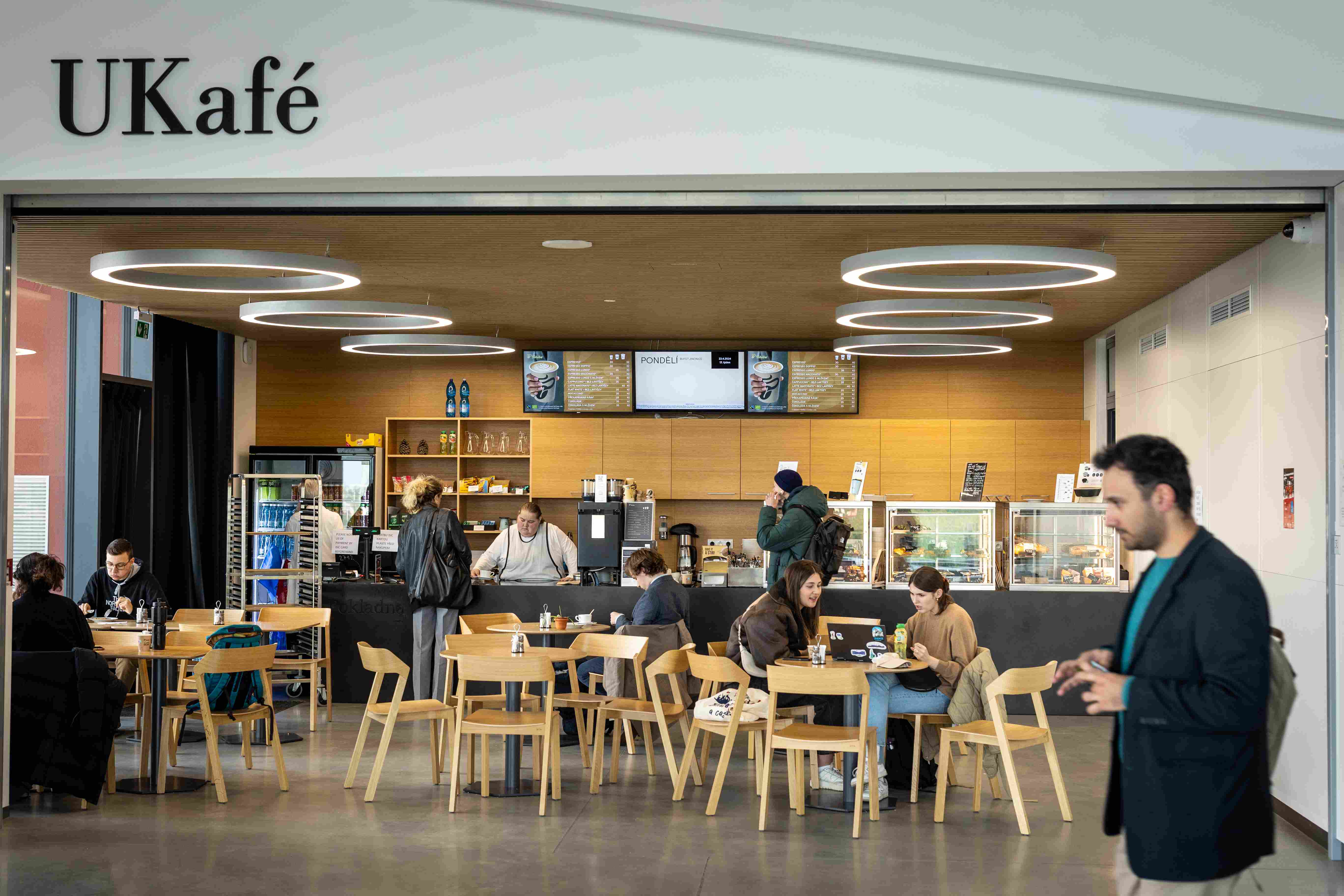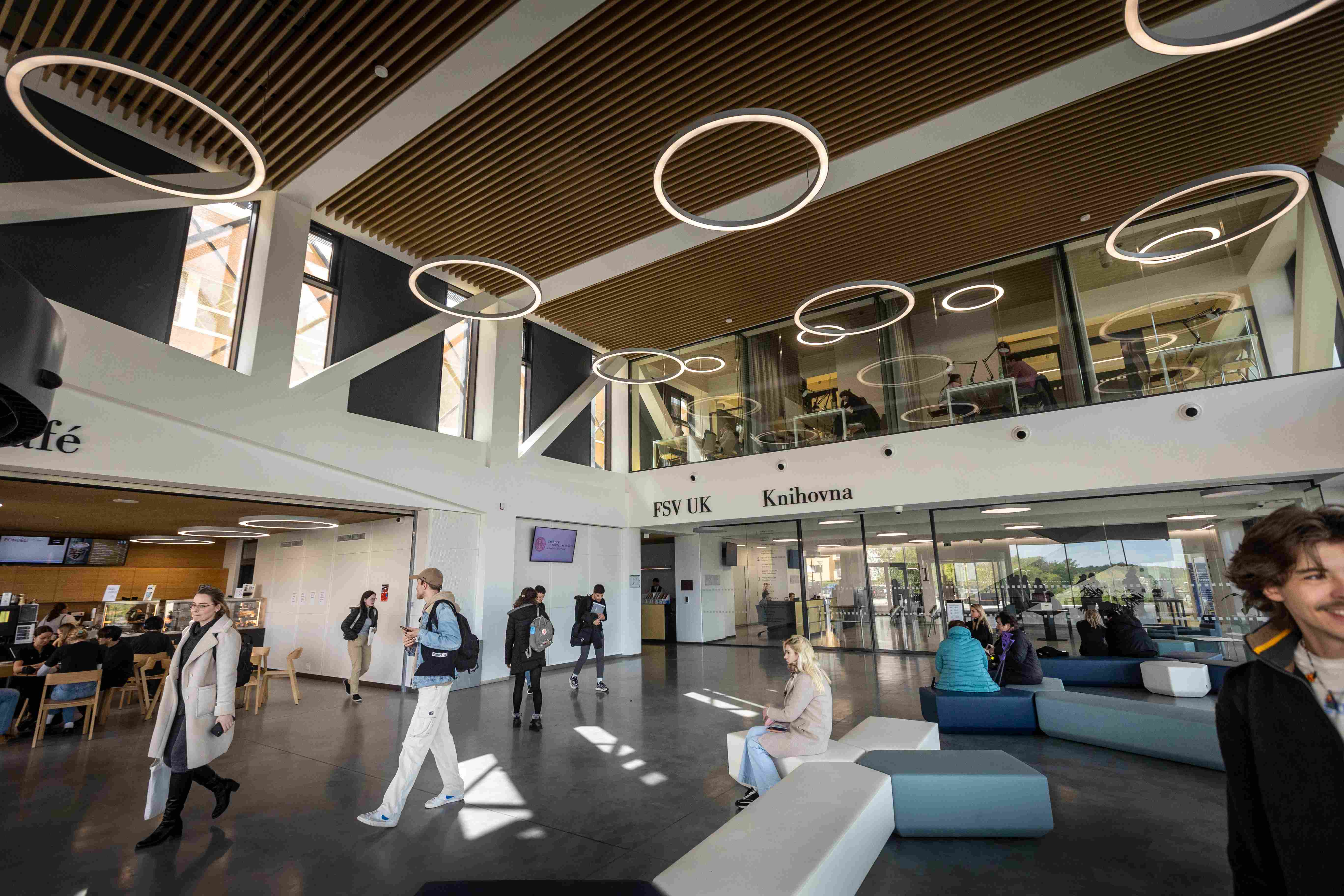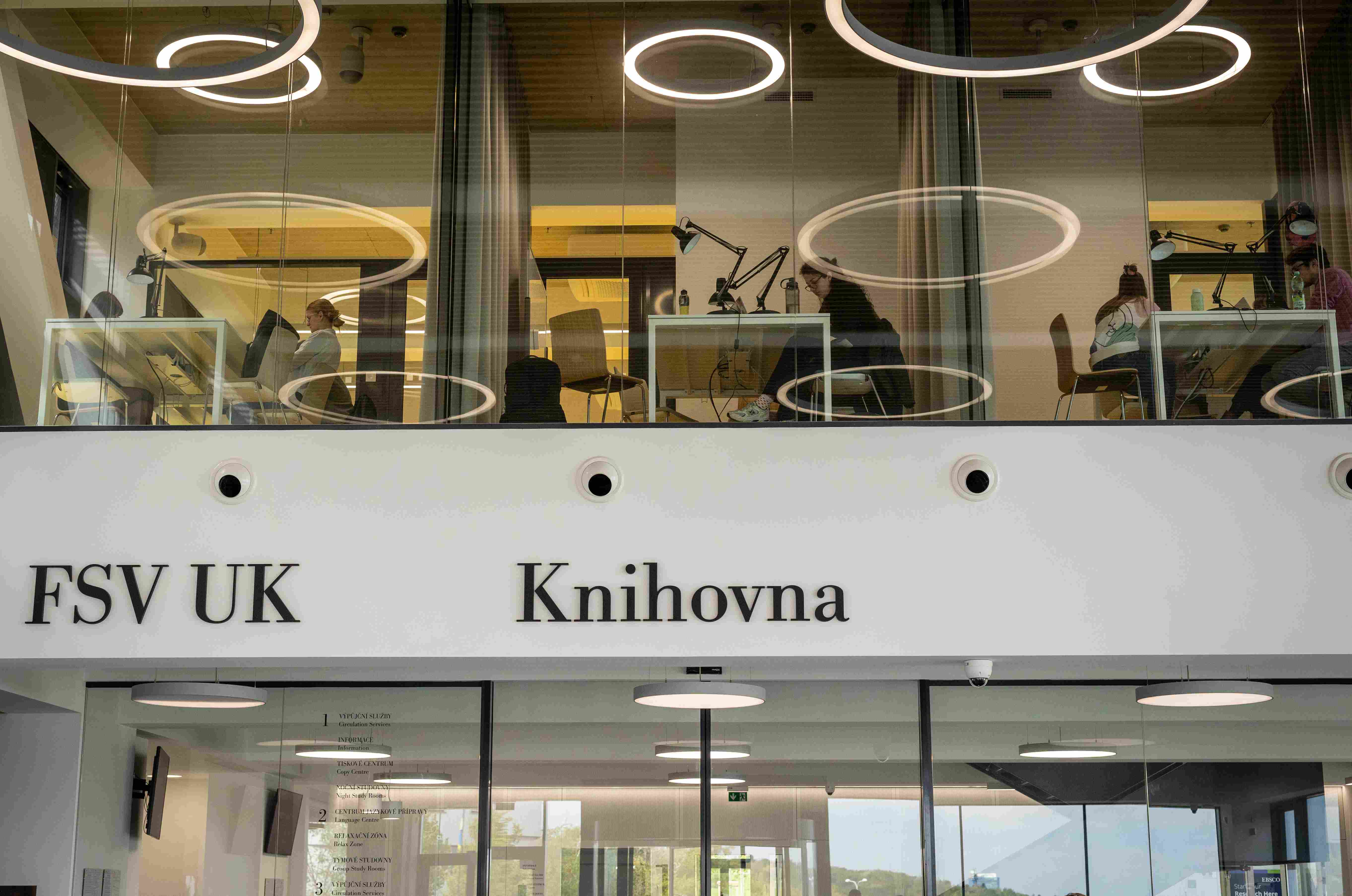 Upozorňuje na to hned u vchodu, kde je příjemná odpočinková platforma s lavičkami i zelení, odevzdávkový box na knížky. Uvnitř v atriu pak studentstvo najde příjemné zázemí; po levé straně útulné bistro, po pravé zase posezení (samozřejmě s rychlou univerzitní wi-fi).