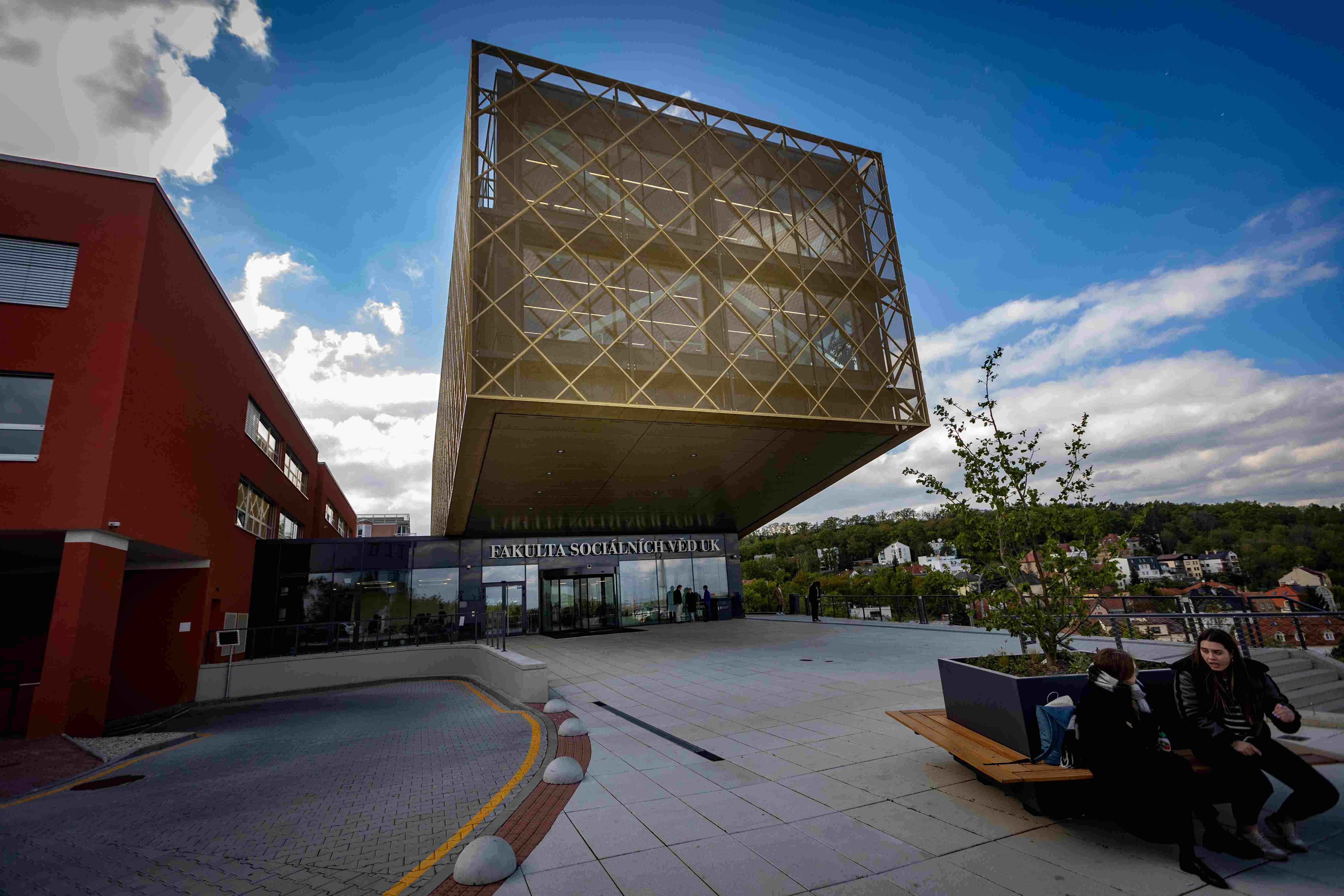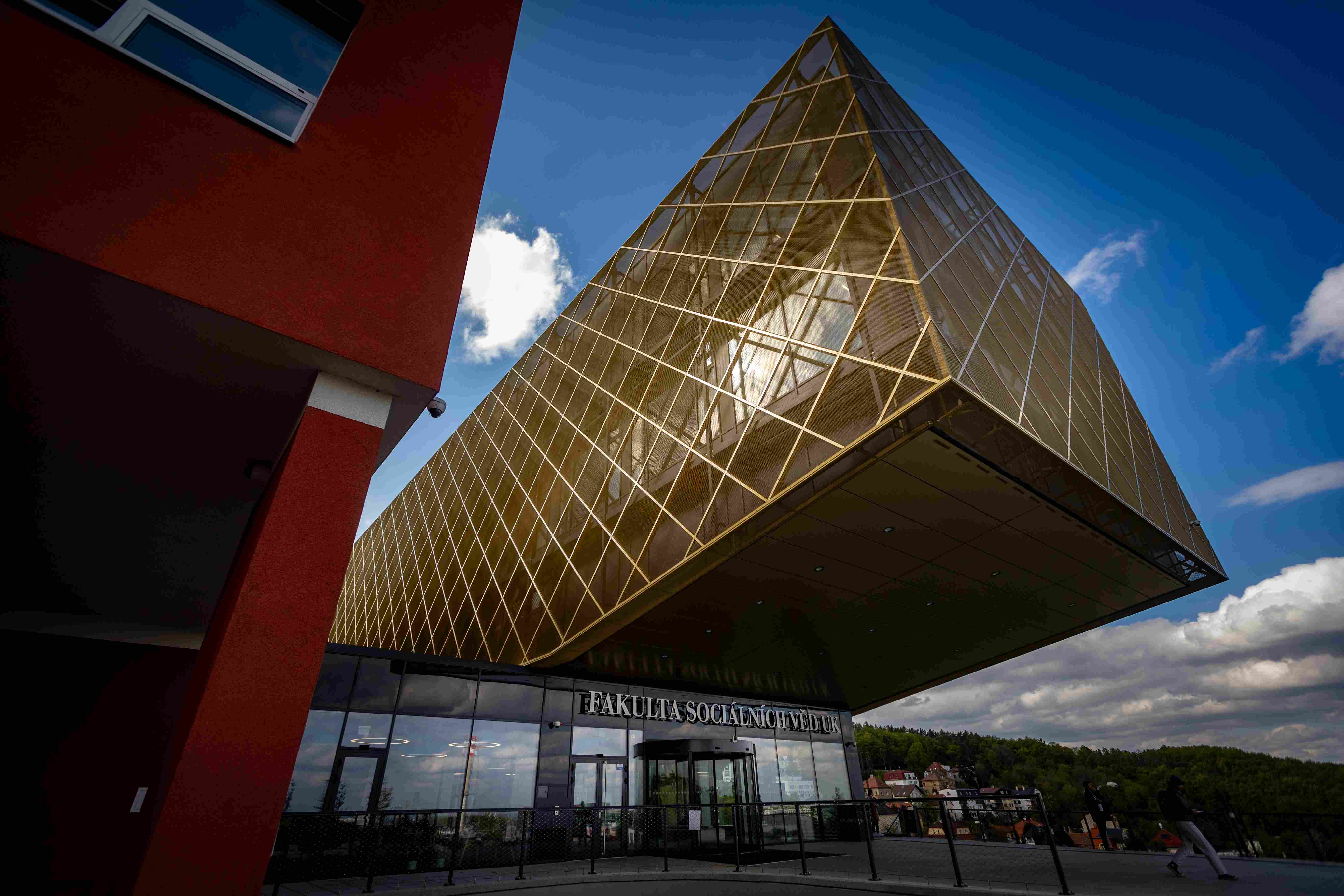 Dominantou univerzitního vršku, kde dříve mívaly částečně zázemí i FHS UK a FF UK, je vytrčená „kostka“ nové budovy do prostoru. Hlavní architektkou projektu se stala Miroslava Tylšová ze studia Apris 3M. Při projektování nové budovy kladli architekti dle tiskové zprávy FSV UK důraz „i na podmínky udržitelnosti a energetickou efektivitu“. Stavbu pokrývá zlatý plášť z takzvaného tahokovu, který objekt zastiňuje a spolu se systémem speciálních nachlazovacích stropů přispívá k větší tepelné pohodě uvnitř. Na plášti je rovněž vyobrazena univerzitní bula – s průměrem 7,6 metru se jedná o největší znak UK použitý v Praze.