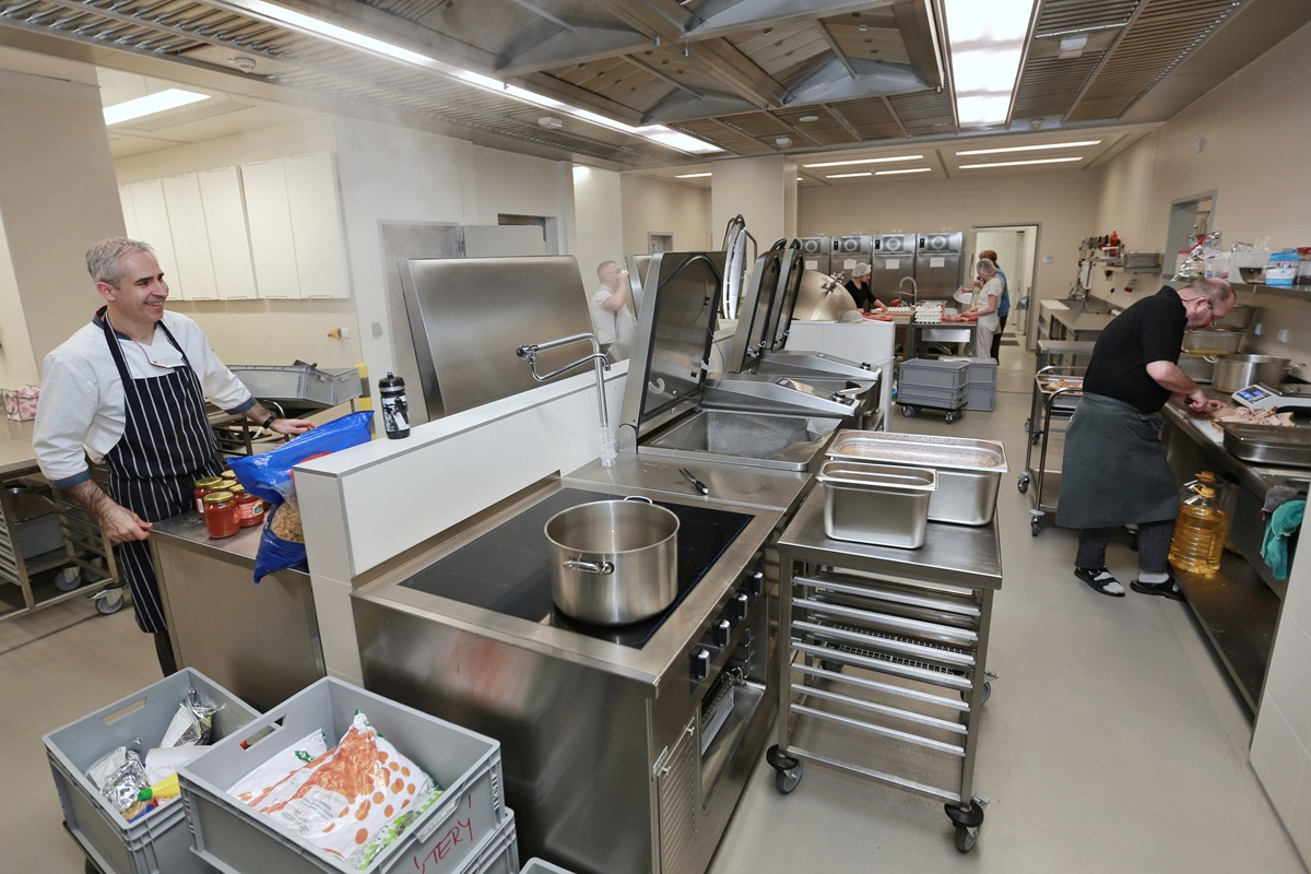 Kampus Lékařské fakulty UK v Plzni stále voní novotou (stavba, která sklidila nejedno architektonické ocenění, byla do plného provozu uvedena v říjnu 2022), studenti i pedagogové nešetří superlativy. Jak se v něm ale vaří? „Skvěle. Kuchyně má vše, co by měla moderní kuchyně mít. Pokud přeci jen najdeme drobné nedostatky, mnohé se daří postupně vychytat. Přirovnal bych ji k dítěti, na které denně čekají nové výzvy: už se naučilo chodit, hezky papá i běhat už umí a začalo nám chodit do školy. Byl bych moc rád, kdyby jednou dokončilo i školu vysokou,“ připodobňuje Leitl provoz menzy.