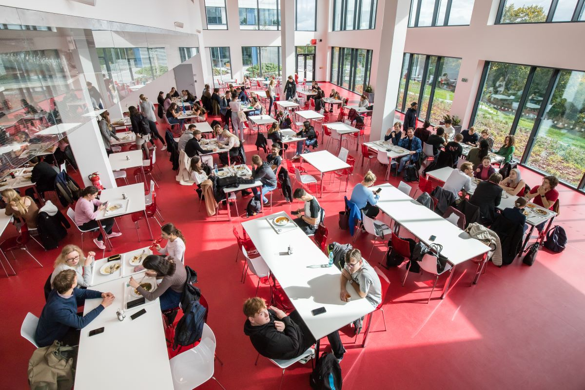 Denně zdejší kuchyně vyexpeduje až tisíc porcí obědů, přičemž nabídka zahrnuje vedle polévky a tří hlavních jídel – jedno z nich je vegetariánské – i omezený počet minutek a rovněž teplý a studený bufet. Kdo si ani tak nevybere, může se přímo nad jídelnou občerstvit v kavárně. Spolu se studenými a teplými nápoji – k mání je zde pravidelně pizza, wrap nebo sendviče či obložené housky – nabídka platí ve všední dny až do 18 hodin!