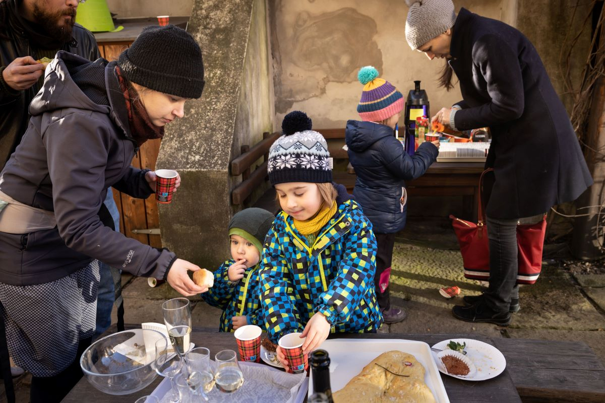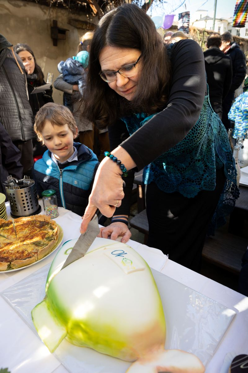 Stoly v mateřince se pod jídlem skoro prohýbaly. To zručné a vypečené (myšleno mající zkušenosti s pečením – pozn. red.) maminky, příznivci a fandové školky na oslavu připravili velkolepé a neodolatelné menu všech chutí, i marcipánová ryba se musela cítit ve svém živlu. Se zdravicí a přípitkem (nejen) rychlými špunty vystoupili mezi prvními děkan fakulty Jiří Zima a proděkan Aleš Soukup: