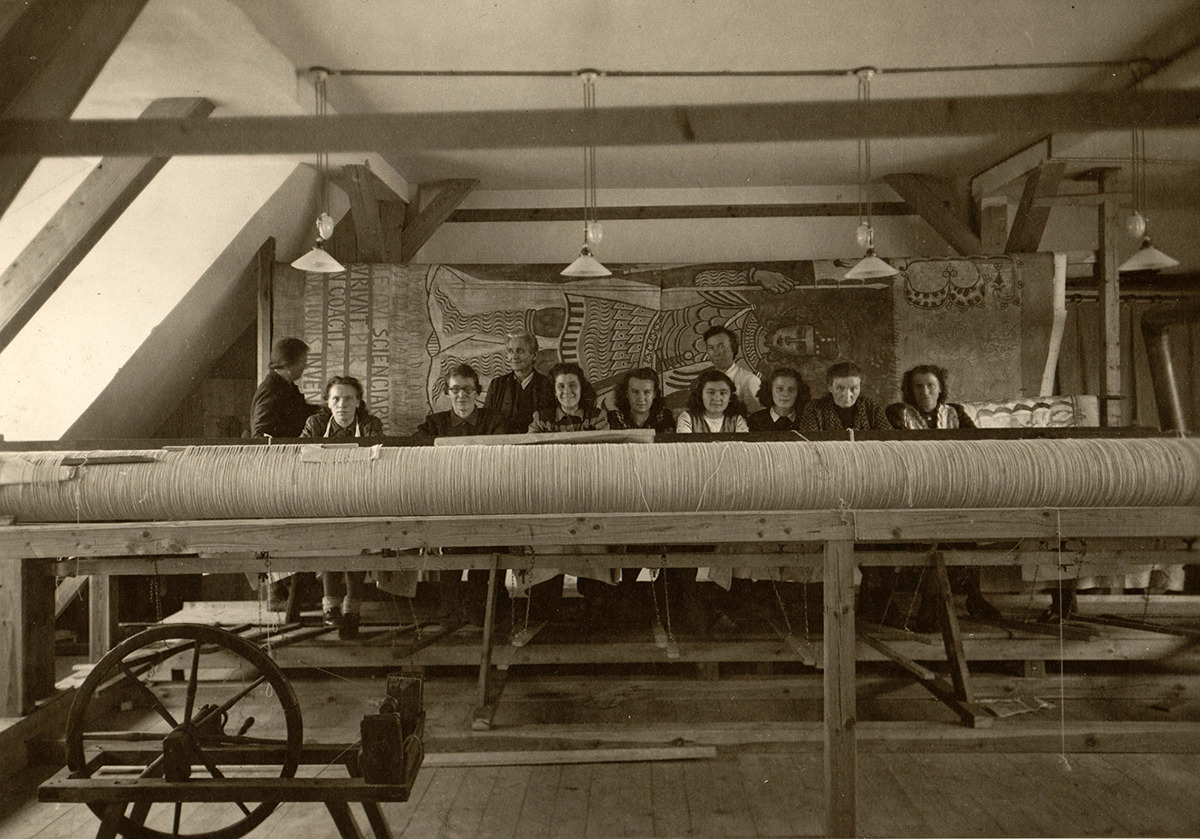 Výroba univerzitního gobelínu v dílnách v Jindřichově Hradci. Vzadu vlevo paní Marie Teinitzerová. FOTO: Státní oblastní archiv v Třeboni. Sbírka - kulturně historický archiv, inv. č. 747, karton č. 97, poř. č. 777.