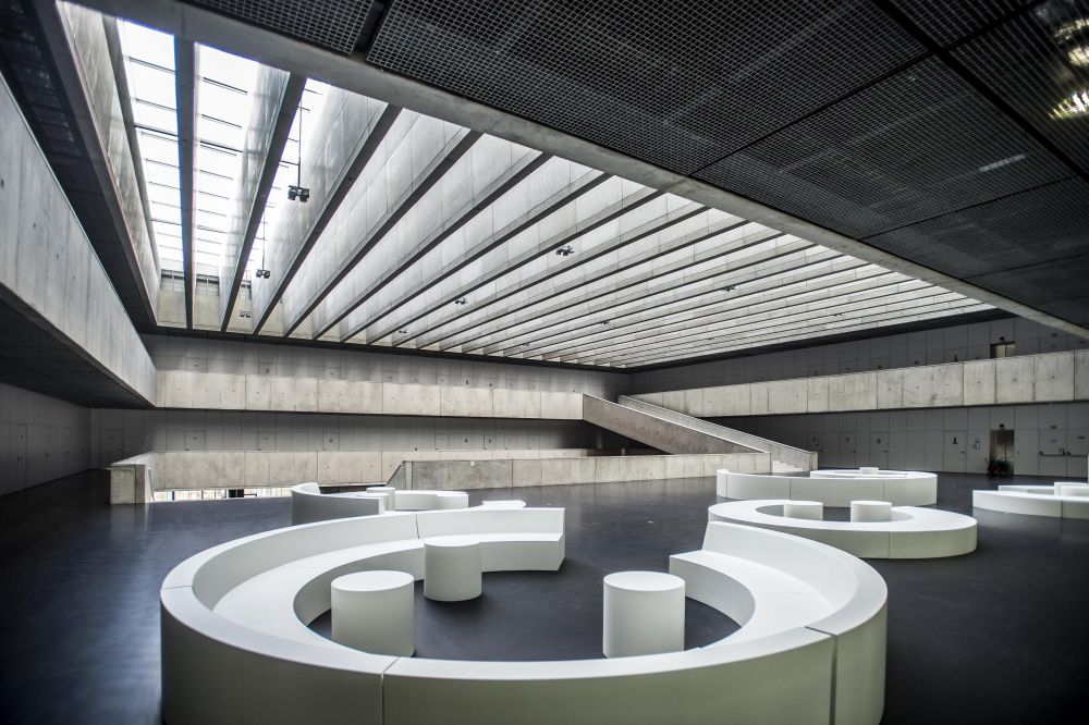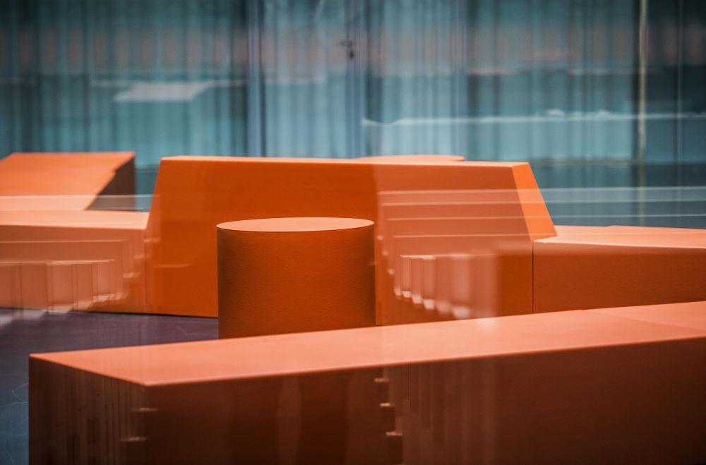 Pro stavby, které realizoval váš ateliér, je typický pohledový beton, sklo a zároveň velmi výrazný barevný akcent v interiéru. Na fakultě se jedná především o nepřehlédnutelné oranžové sezení ve dvoraně…