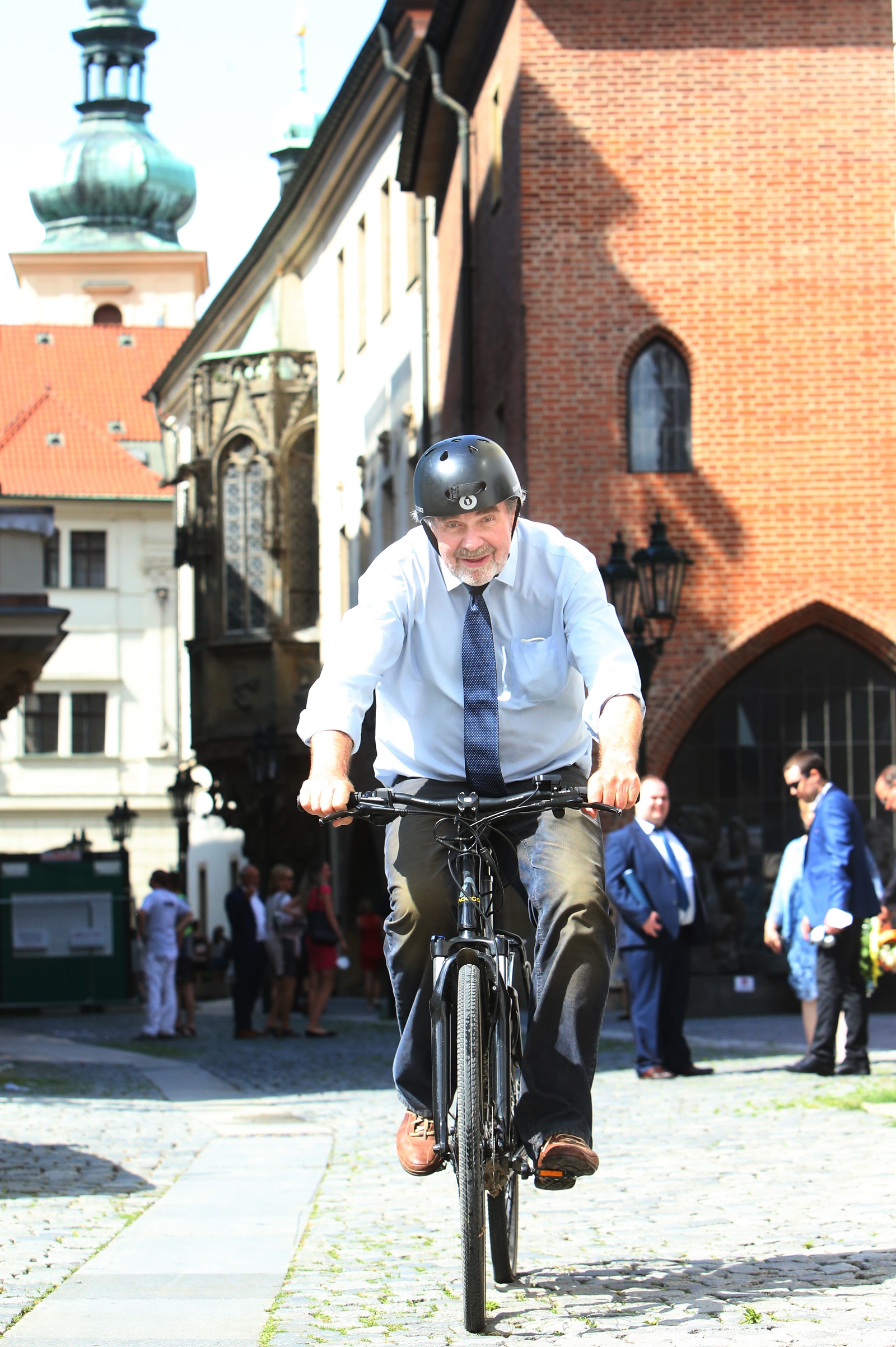 Že nejde jen o můj pocit, ale že je jízda na elektrokole v pražském provozu efektivní a zábavná, mi záhy potvrzuje i prorektorka Univerzity Karlovy Radka Wildová. „Dodávka mi zablokovala auto. Můžete mi půjčit kolo? Potřebuji se co nejrychleji dostat na rektorát,“ žádá mne u fakulty. A tak měníme dopravní prostředky. Prorektorka v dlouhé sukni a podpatcích míří v Jakubově doprovodu z Pedagogické fakulty UK na Ovocný trh v sedle elektrokola, fotograf startuje její záhy odblokované auto a já si půjčuji jeho klasické kolo, se kterým dojedu do cíle ke Karolinu.