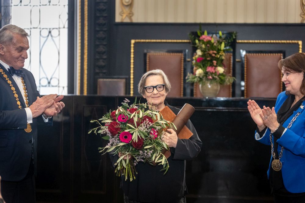 Agnieszka Holland převzala mezinárodní Cenu Karla IV. z rukou rektorky UK Mileny Králíčkové a primátora Prahy Bohuslava Svobody (foto: Hynek Glos).