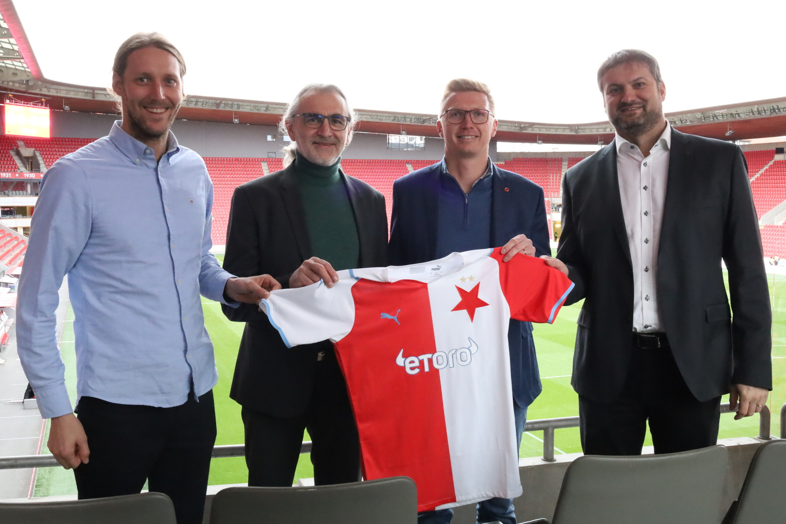 Na stadionu v Edenu zleva: šéf mládežnických kondičních trenérů Slavie David Bujnovský, profesor František Zahálka, manažer mládežnické akademie Slavie Petr Hurych, a děkan FTVS UK Miroslav Petr.