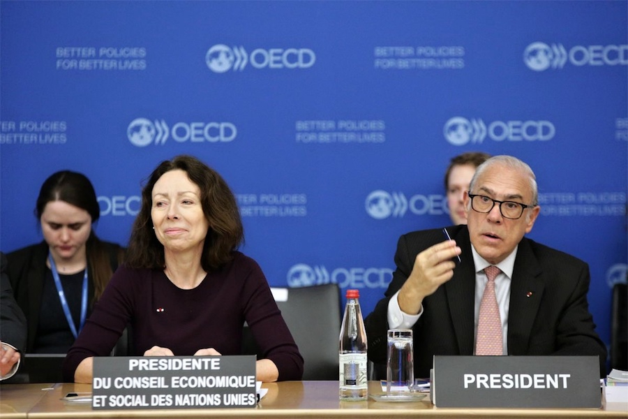 S AI robotem Sofií v rámci prvního interaktivního dialogu při jednání Hospodářské a sociální rady Organizace spojených národů ECOSOC.