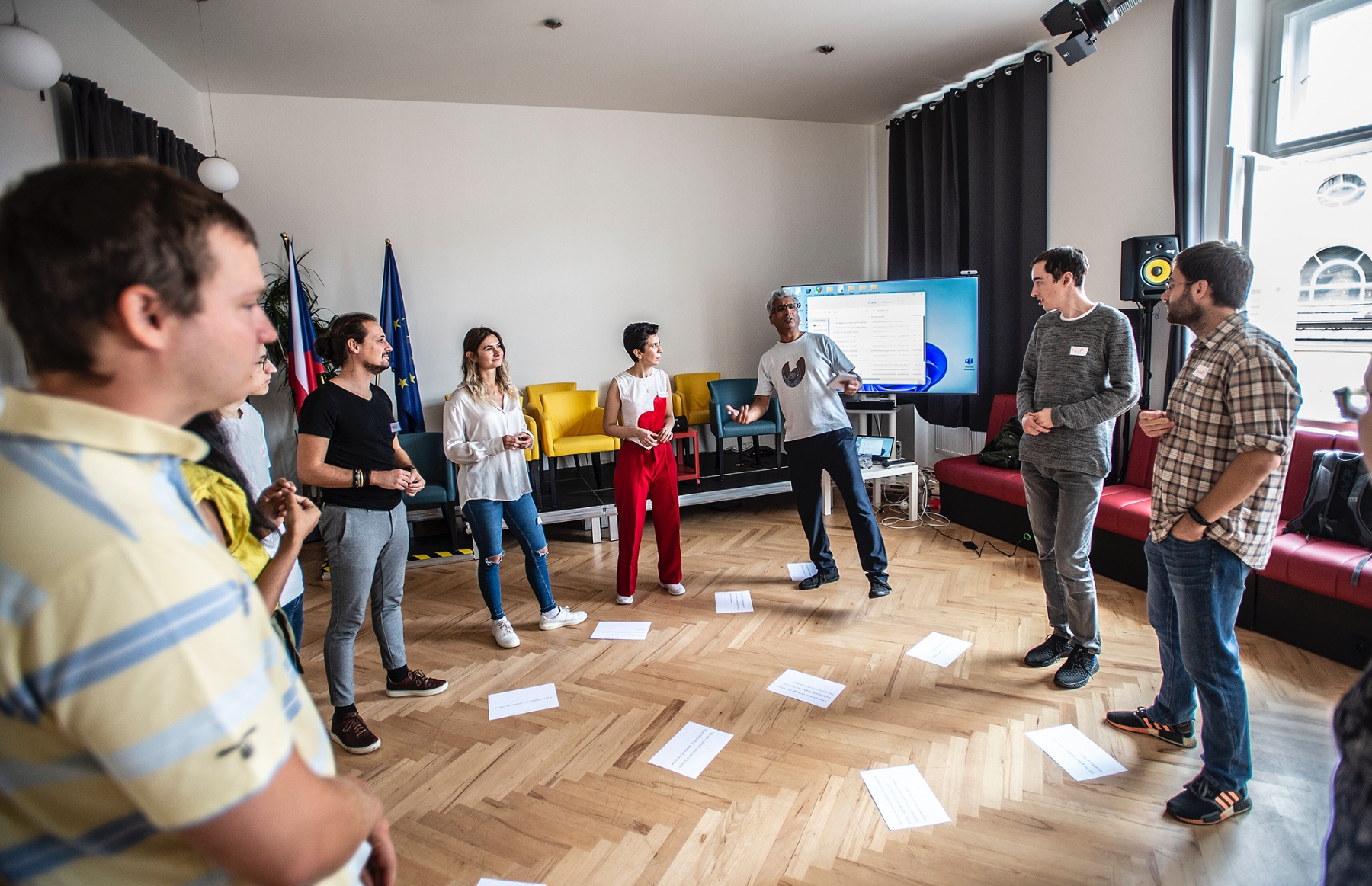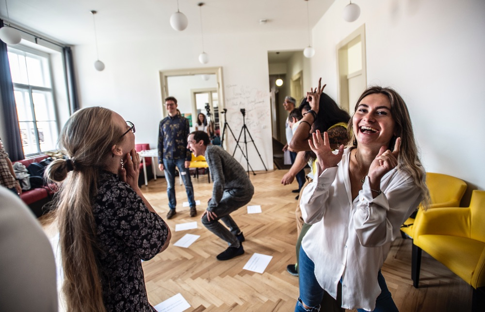 Lektor herectví a angličtiny Jat Dhillon (uprostřed) si pro účastníky a účastnice připravil řadu praktických cvičení.