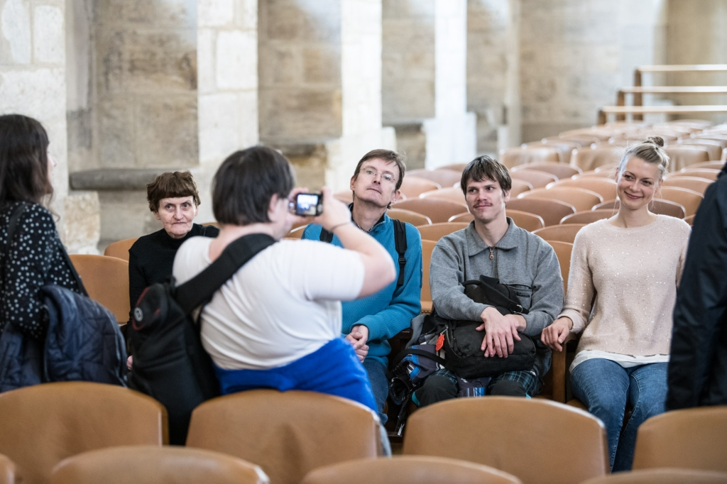 Procházíme Křížovou chodbou, nahlížíme skrz okna na Husův dvůr, který vzedme vlnu nadšení, a míjíme triptych Povznesení Jiřího Sozanského, který ji zase viditelně uzemní. Když vystoupáme po schodech do Velké auly, vypadá to, že naši přátelé z Lemniskáty jsou téměř sraženi na kolena. A rozhodně ne fyzickou únavou. U mě to působí vlastně skoro stejně: Můžete být v tomto sále třeba každý týden, stejně vás zas a znova dostane zdejší genius loci. Jak na tom pak má být člověk, který je zde poprvé?! Ráďa, která mi prozrazuje, že její bratr Tomáš tu na rozdíl od ní už byl, je taky ohromena, ale nezapomíná na své hlavní poslání. A už stíhá zamířit objektiv na Karla IV., aby byla záhy středem jejího zájmu ústřední tapiserie a za chvíli kaple a taky píšťaly varhan a… Spoušť fotoaparátu je v permanentní akci.