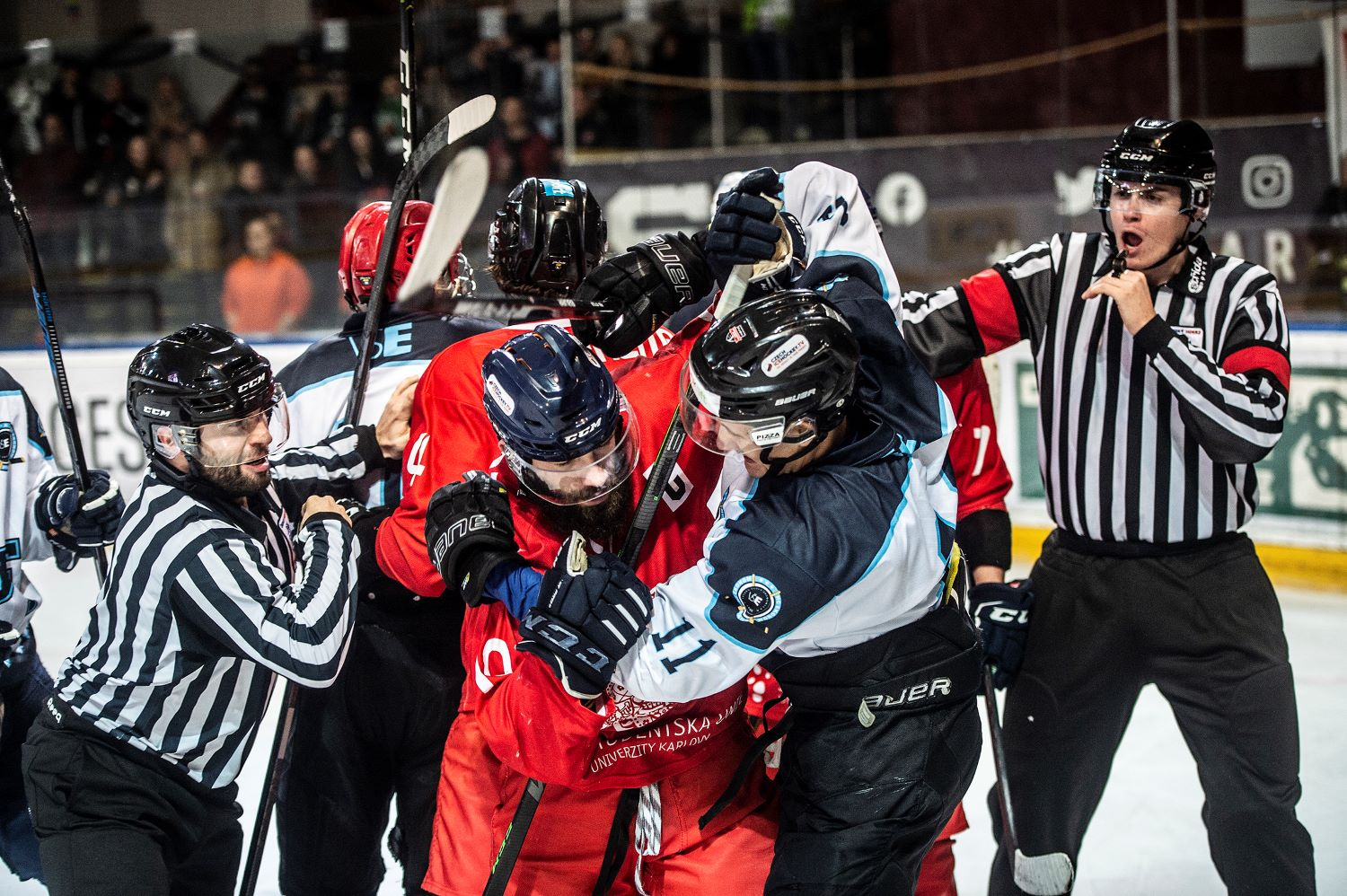 Hokejové bitvy se tradičně účastní čtyři výběry pražských univerzit, které jsou nejprve nalosovány do semifinále. Univerzita Karlova, za níž nastoupilo i devět šampionů univerzitní ligy z UK Hockey Prague, bojovala proti Vysoké škole ekonomické (VŠE). A bylo to obrovské drama, které dospělo až do samostatných nájezdů. V nich byla nakonec Karlovka šťastnější díky Jiřímu Hozákovi a postoupila do finále.