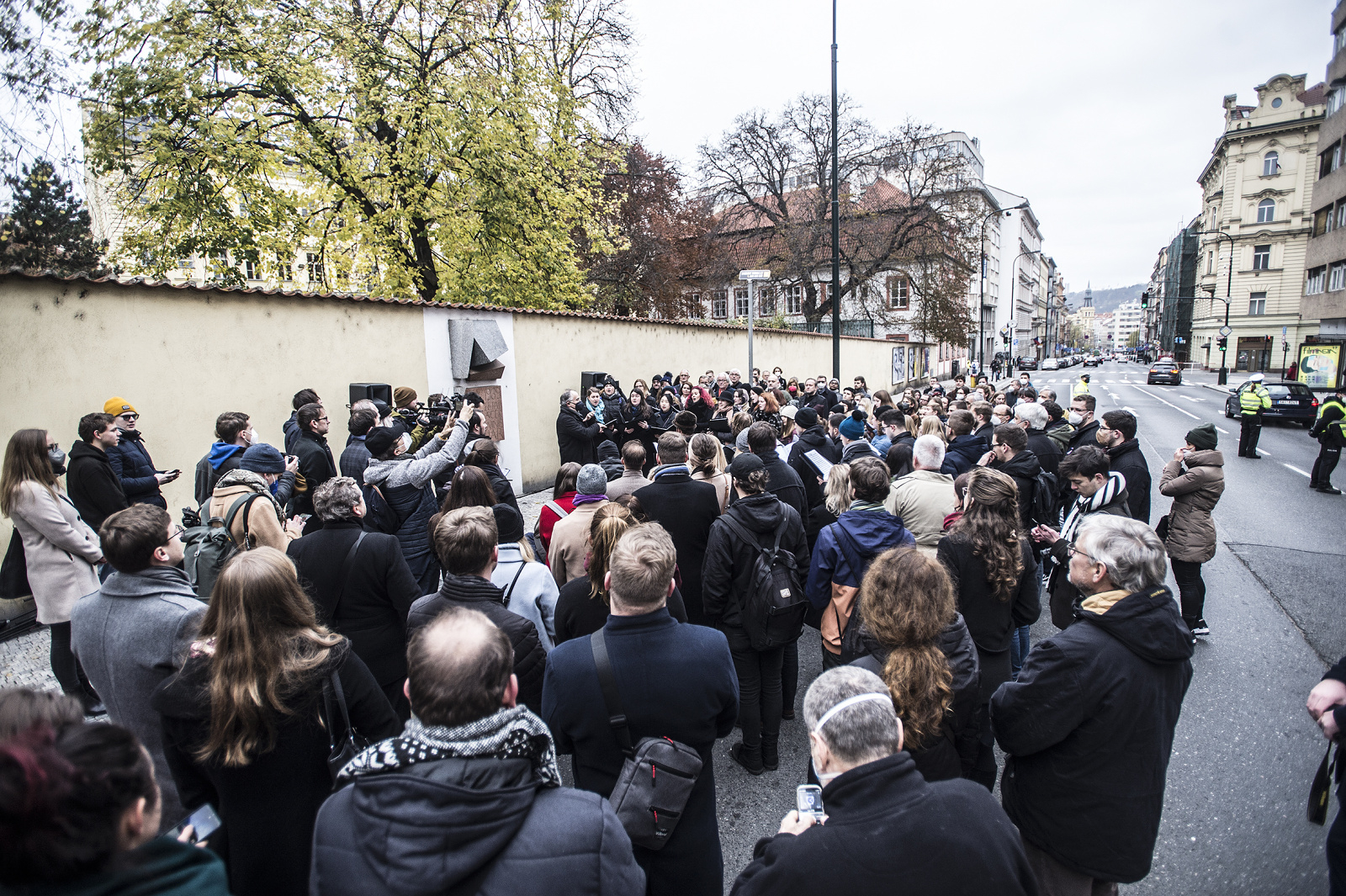 Od Hlávkovy koleje se pak po půl jedenácté mnohohlavý průvod vydal k pomníku v Žitné ulici...