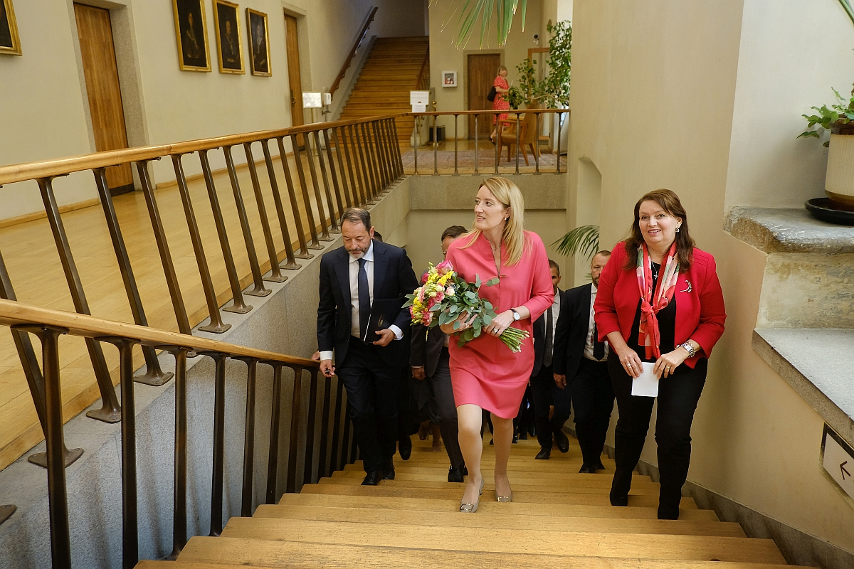 Rektorka UK Milena Králíčková vítá předsedkyni EP Robertu Metsolaovou (vlevo prorektoři Markéta Martínková a Ladislav Krištoufek).
