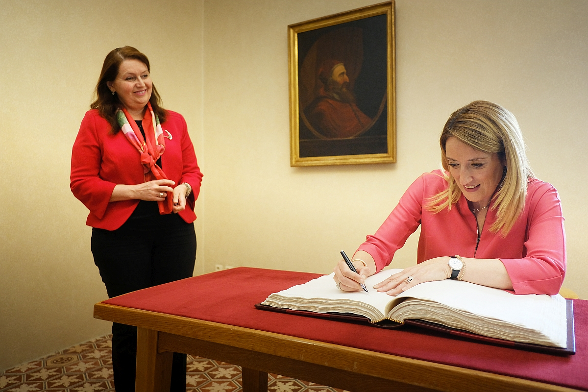 Předsedkyně EP Roberta Metsolaová se podepisuje do pamětní knihy Univerzity Karlovy za přihlížení JM Mileny Králíčkové (vlevo).