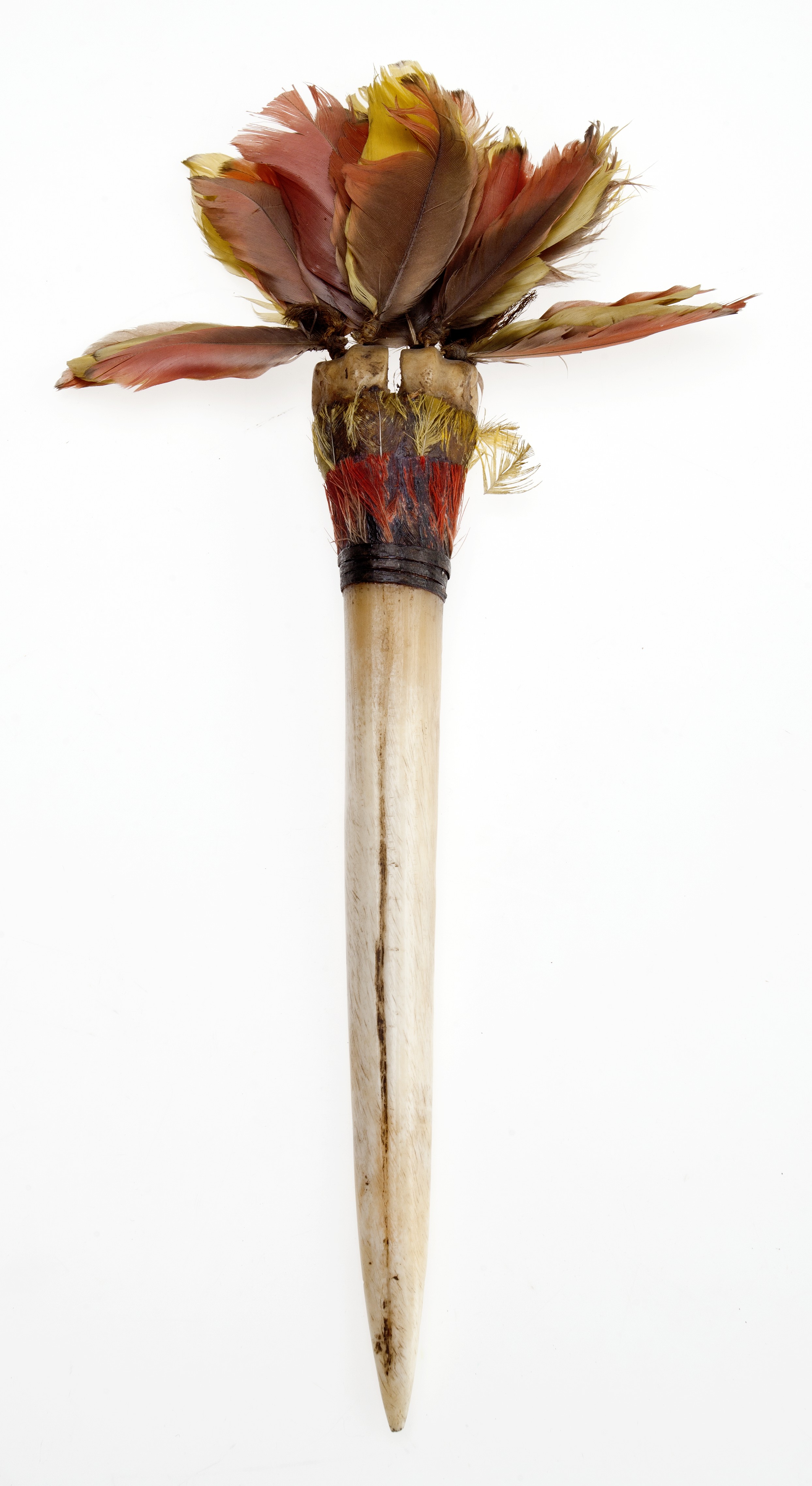 K pokladům, které stojí za obzvláštní pozornost, počítá také péřové ozdoby Chamacoců, jež dovezl Frič, a ještě starší péřové čapky kmene Tupinambá, přivezené z Brazílie českými jezuity už v 17. století. „Jsou to možná jedny z nejstarších etnografik z Jižní Ameriky v Evropě,“ připomíná Tereza Melicharová. A do své pomyslné Top 5 přiřazuje ještě náprsní ozdoby z pásovce od kmene Bororo, jejichž původ z rakousko-uherské expedice do Brazílie mezi lety 1817 až 1821 odhalila až letos (na fotografii je dýka z kosti od brazilského kmene Bororo, kterou získali čeští přírodovědci v císařských službách kolem roku 1820).