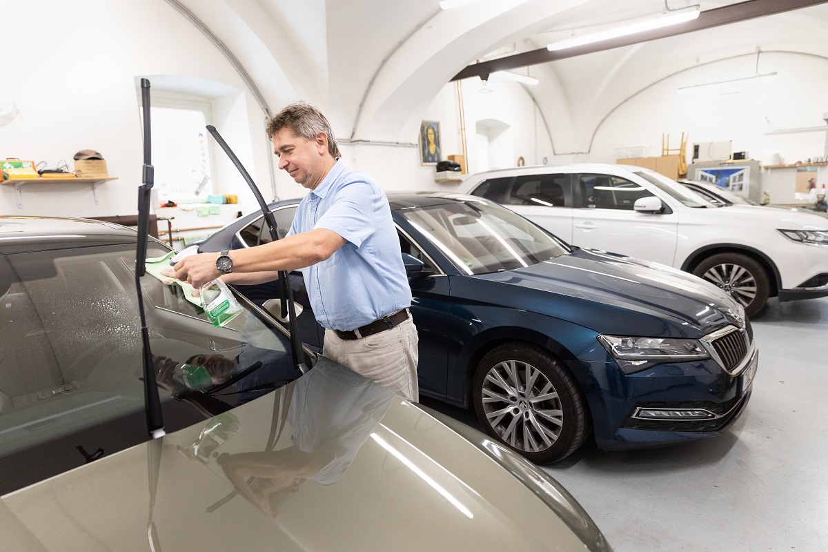 Vozový park rektorátu Univerzity Karlovy čítá tři auta Škoda Superb, jednu octavii, šest elektrokol a dvě dodávky: Ford Transit a Volkswagen. Dříve, než se stačím zeptat, proč tvoří vozový park UK takřka výhradně vozy Škoda, stihne Antonín Rezek, ředitel Správy budov a zařízení, odpovědět: „Prostě jsme česká univerzita, proto auta vyráběná v Čechách, která dokonale vyhovují potřebám univerzitního managementu.“