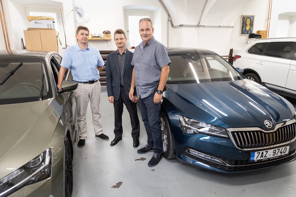 Univerzitní řidiči (zleva) Jan Jiroušek, Jan Štamberk a Rostislav Broda spolu se svěřenými limuzínami Škoda Superb pod okny rektorátu UK.