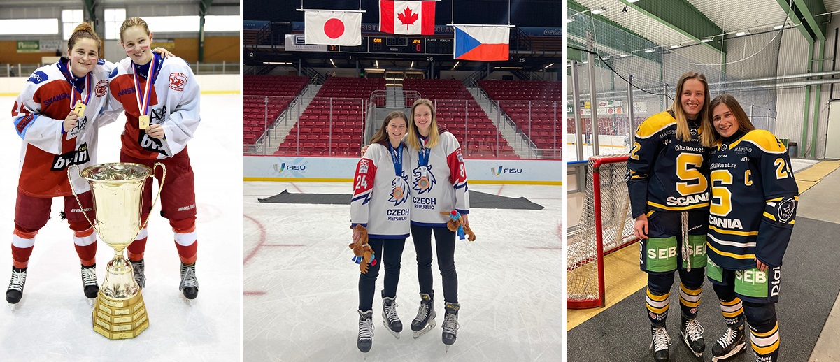 SPOLU. Adéla Jůzková a Barbora Patočková ve Slavii, na univerziádě, a ve švédském Södertälje. FOTO: archiv Adély Jůzkové.