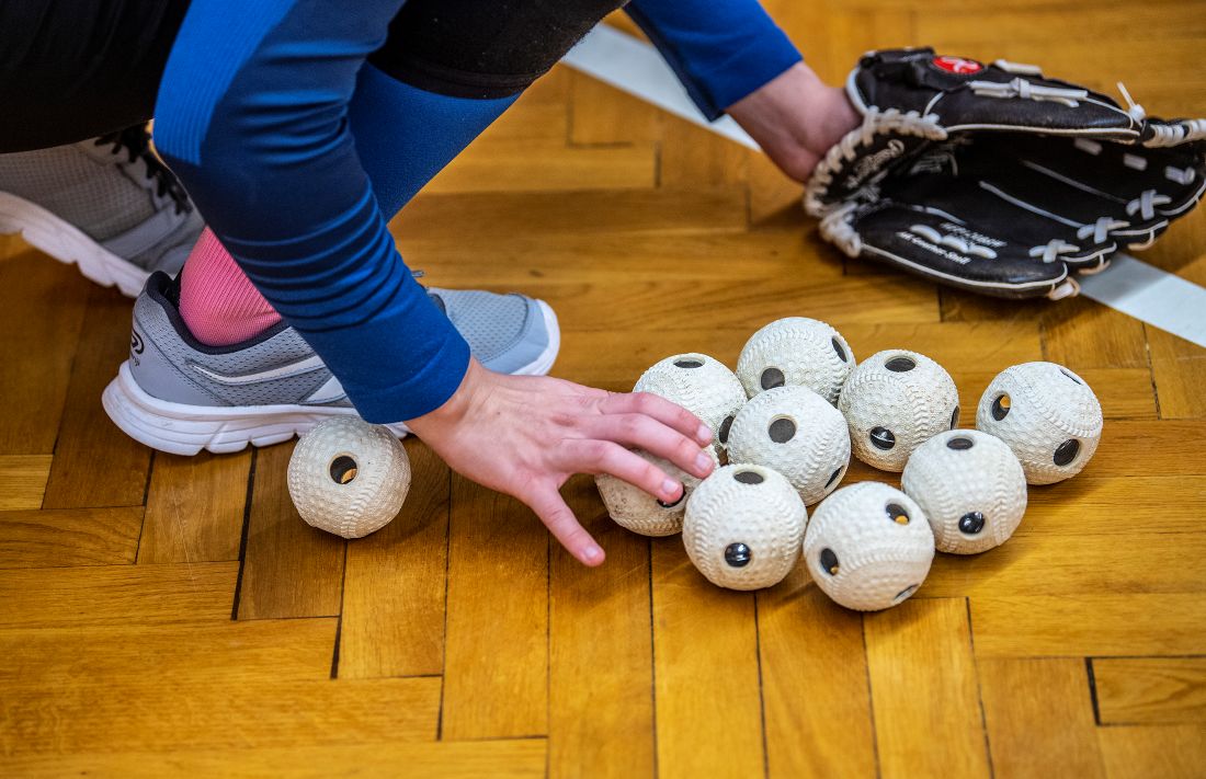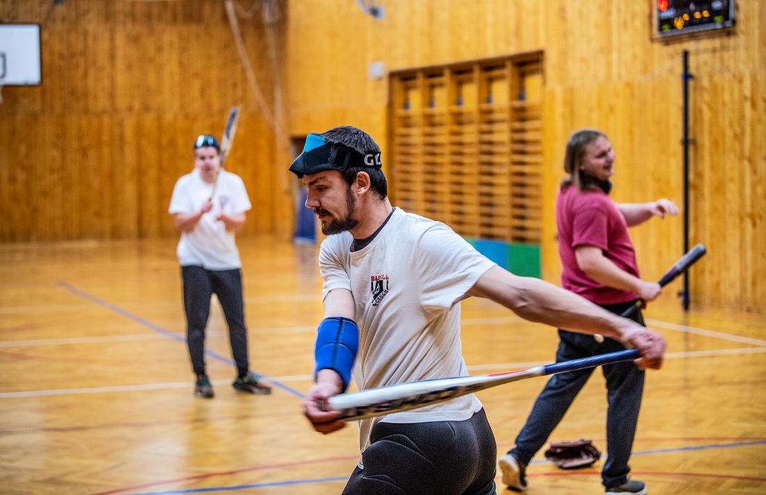 Srážka nehrozí. „Blind baseball se hraje na klasickém baseballovém hřišti, ale hráči stojí jen v levém vnějším poli, zatímco běžci běhají po metách ve vnitřním. Tudíž vůbec nemůže dojít ke kolizím mezi polařema a pálkařema,“ vysvětluje Tereza. Nadhazovač není, protože nevidomí si míček s rolničkami uvnitř nadhazují sami. Jak to provést co nejefektivněji, obě mentorky trpělivě vysvětlují svým svěřencům a svěřenkyním na tréninku v tělocvičně.