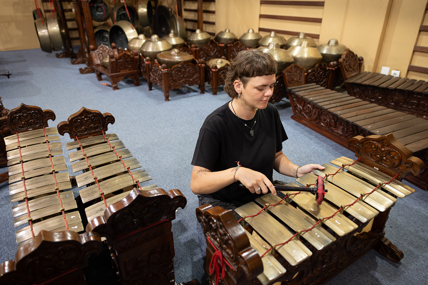 Rodačka z Prahy s hudbou vyrůstala. „Moje máma je úžasná hudebnice, hraje na kytaru a krásně zpívá. Od malička jsem jezdila na hudební tábory pro rodiče s dětmi, spoustu let jsem hrála na housle a myslím, že mám hudební sluch.“ Před zahájením vyučování si patnáct až dvacet studentů rozdělí nástroje – metalofony, gongy, xylofony a nejrůznější bubny – a učí se všichni dohromady. Západní způsob výuky učitele s jediným žákem, jako když se u nás chodí do houslí nebo berou hodiny hry na klavír, by nedával smysl. „Ze začátku jsem byla trochu nejistá v notaci, občas to dokáže být pěkný zmatek, rytmus se různě prolíná, ale dohromady to dává smysl.“